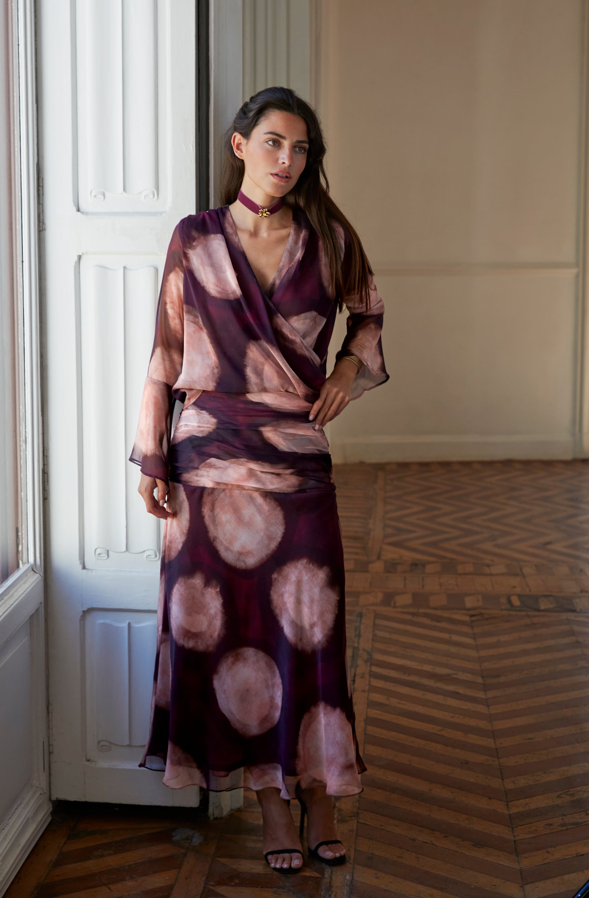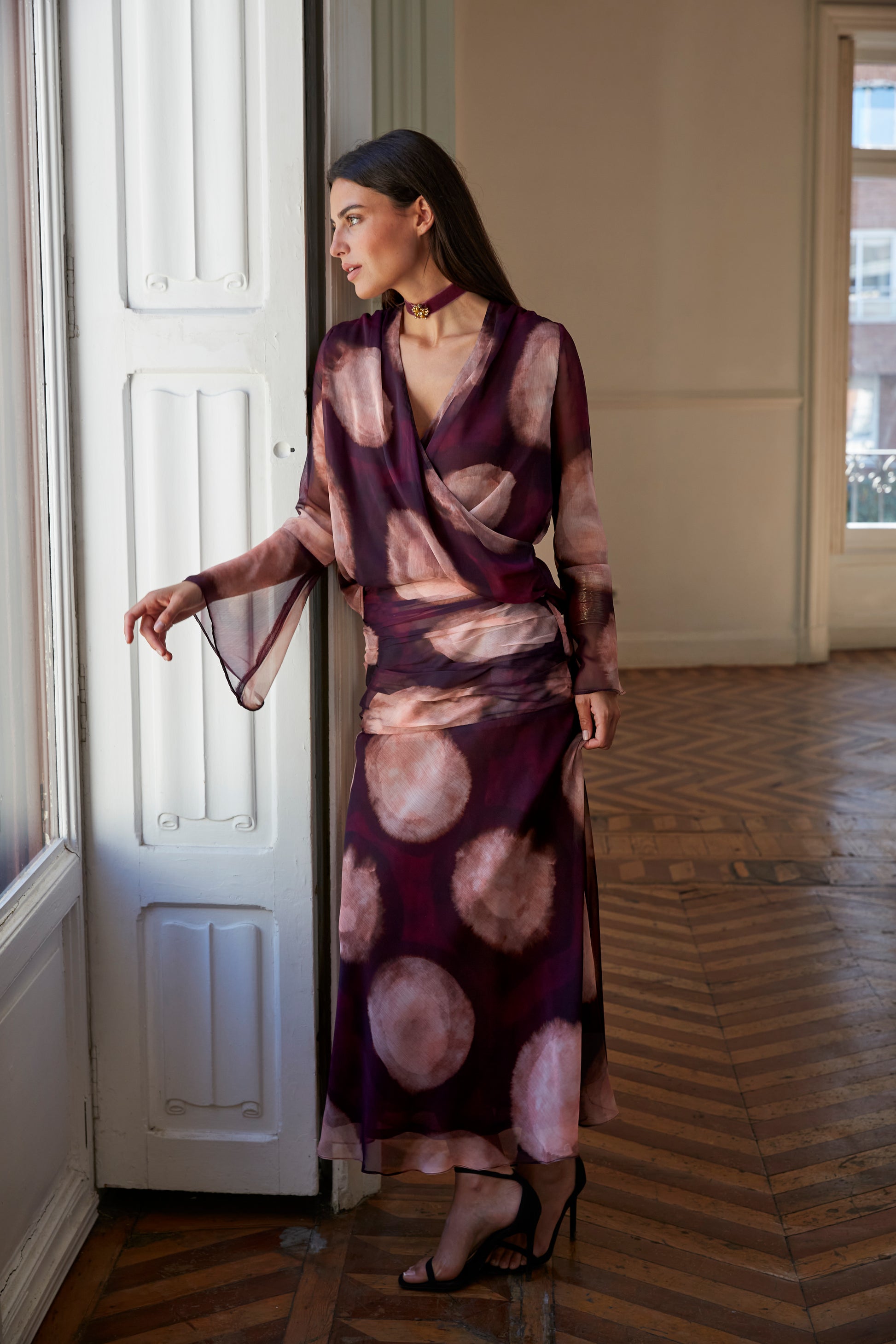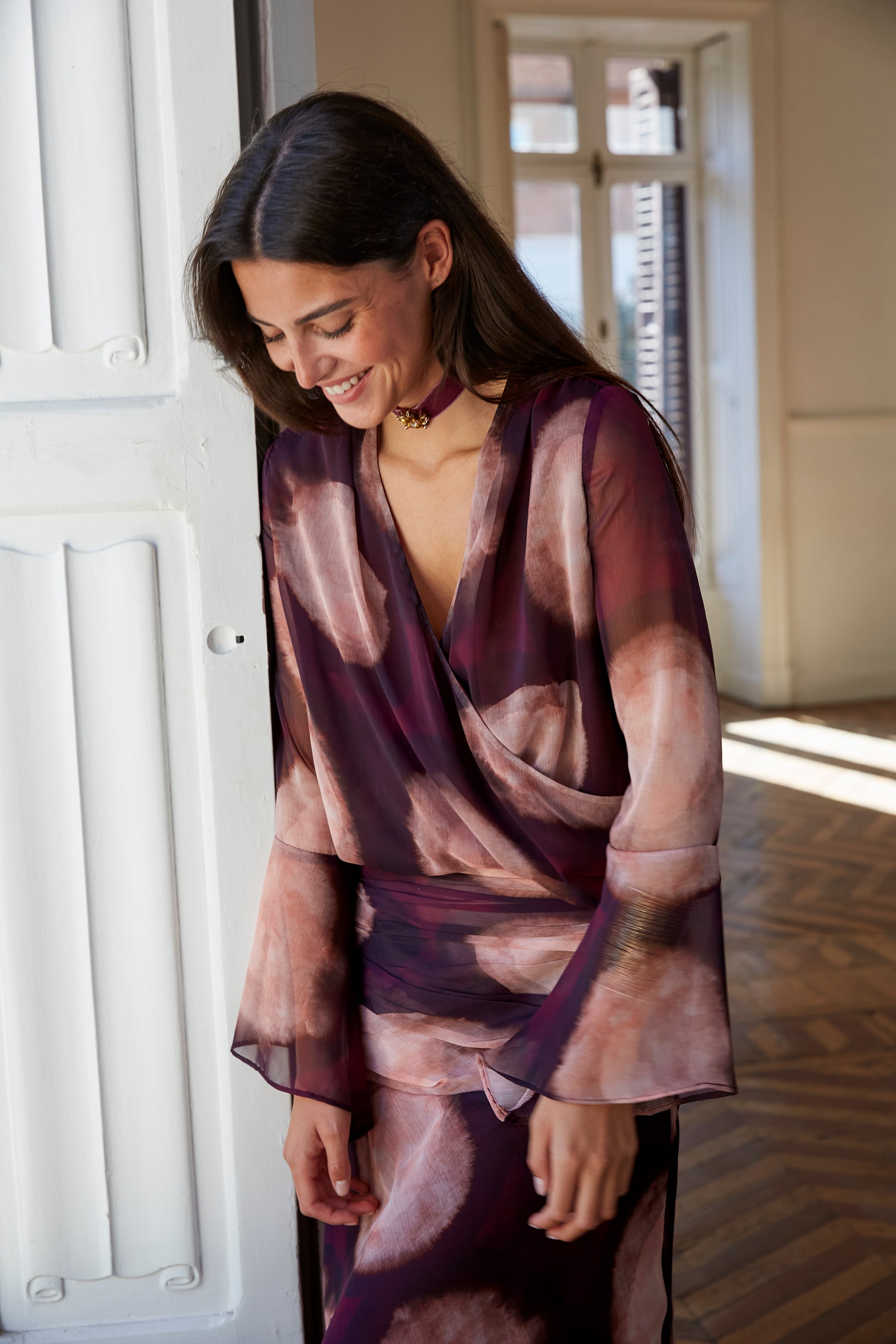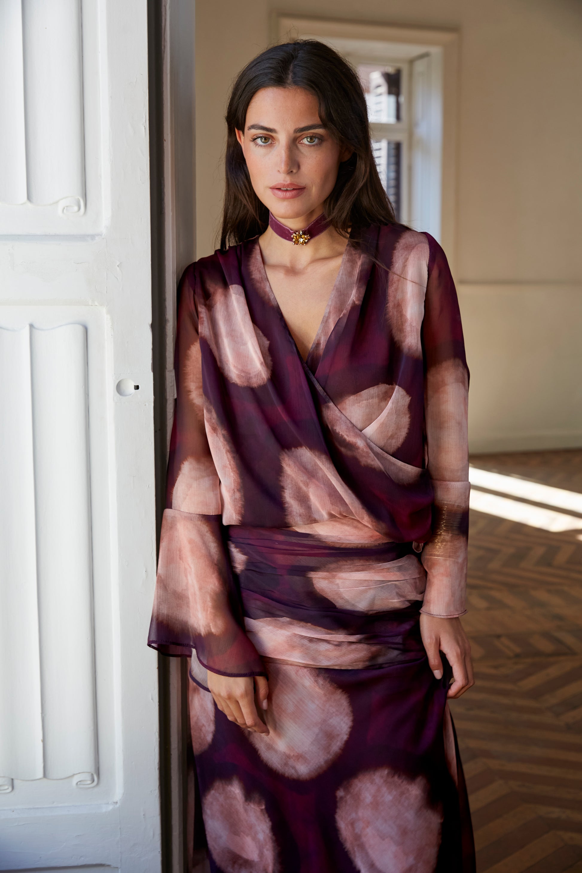 Midi party set, crossover blouse, with long sleeves that ends in an asymmetrical ruffle. Skirt with draped waist. Made of fine eggplant printed chiffon with nude circles. Lined set.