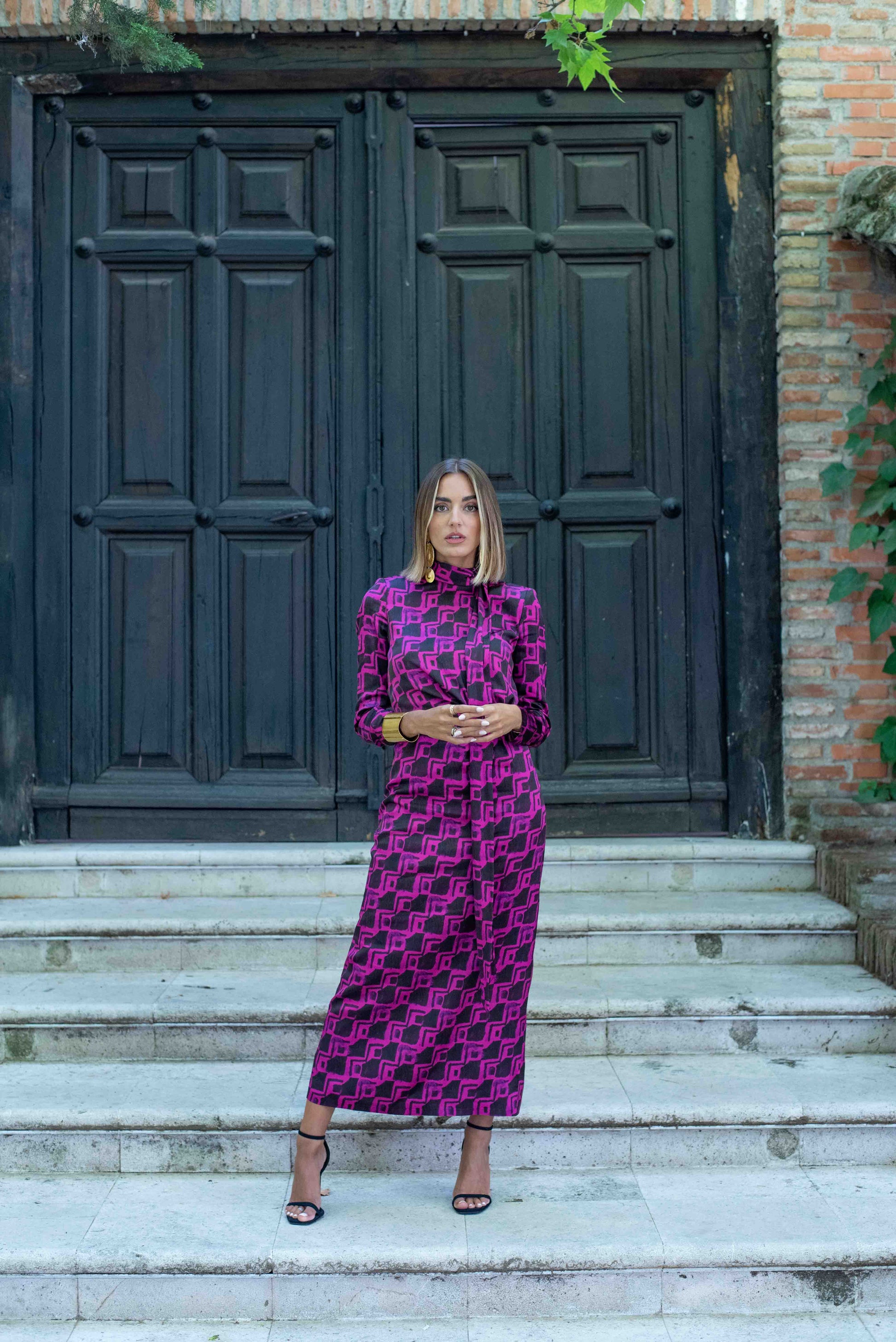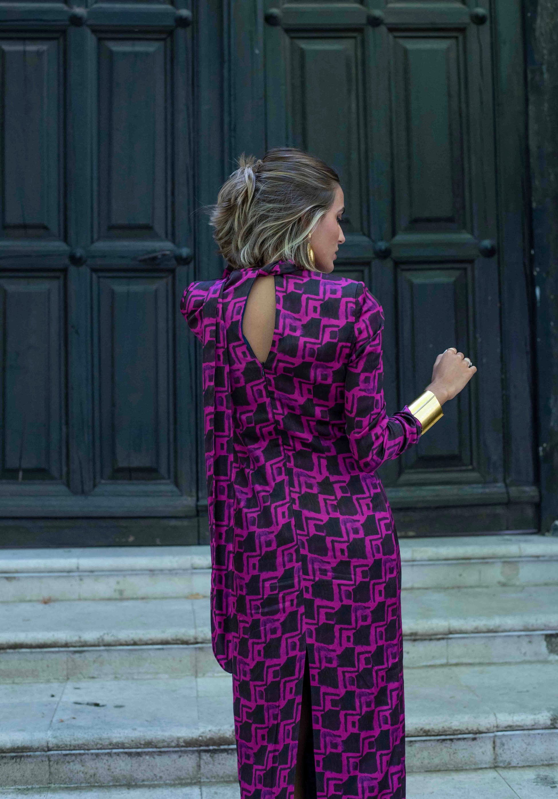 Midi party dress with a long bow at the neckline, gathered waist at the side, and a straight skirt in a geometric print of navy and fuchsia satin crepe. Lined dress.