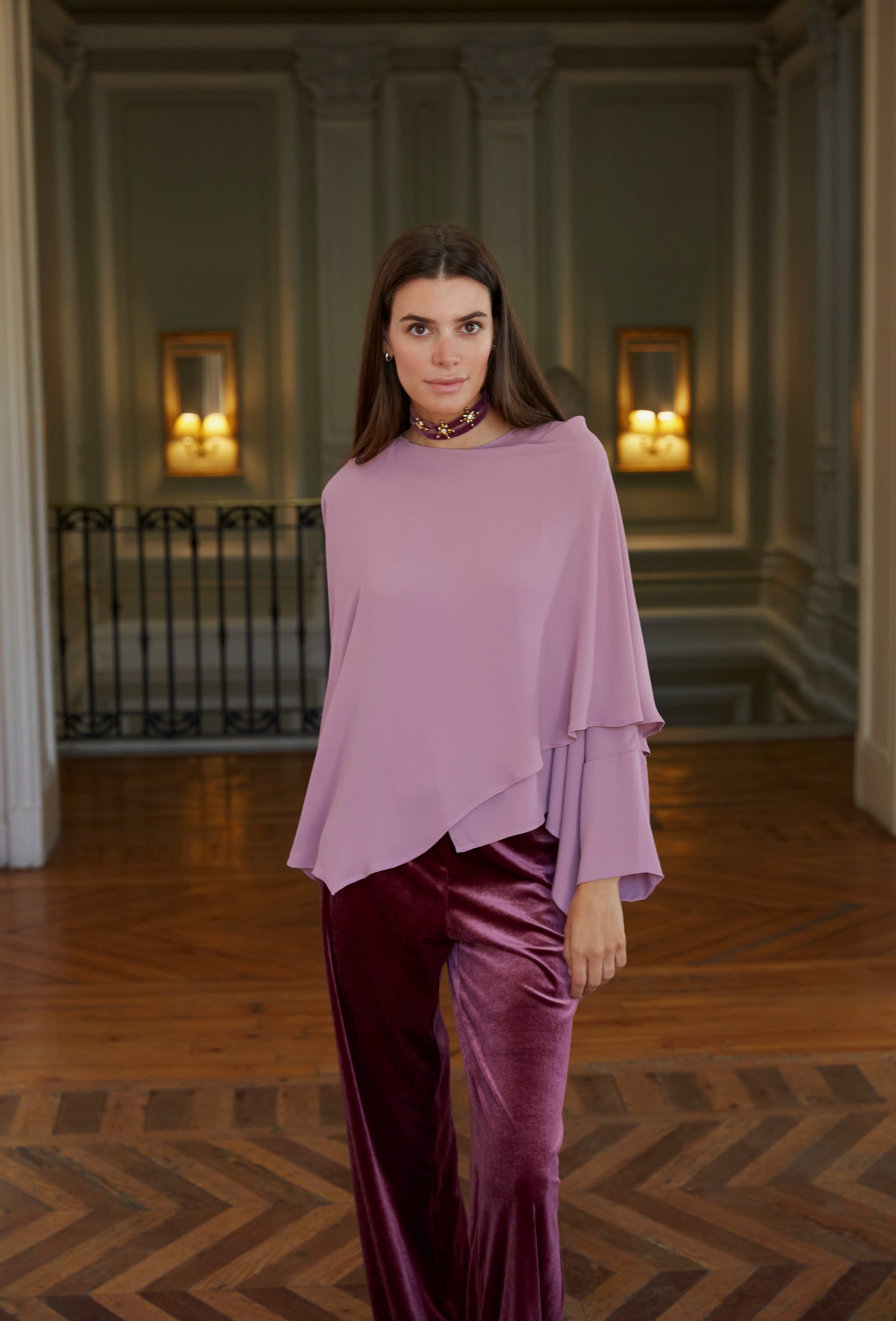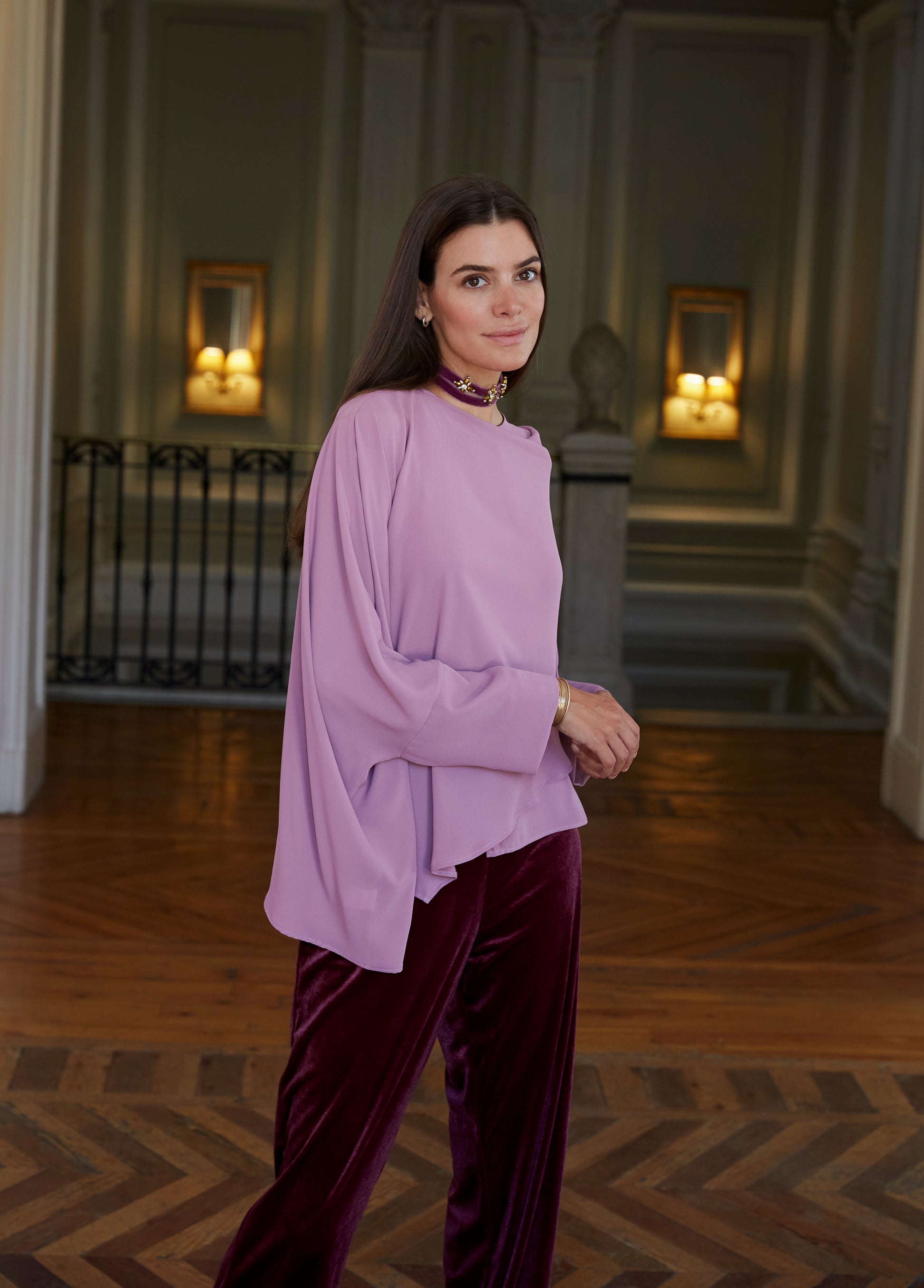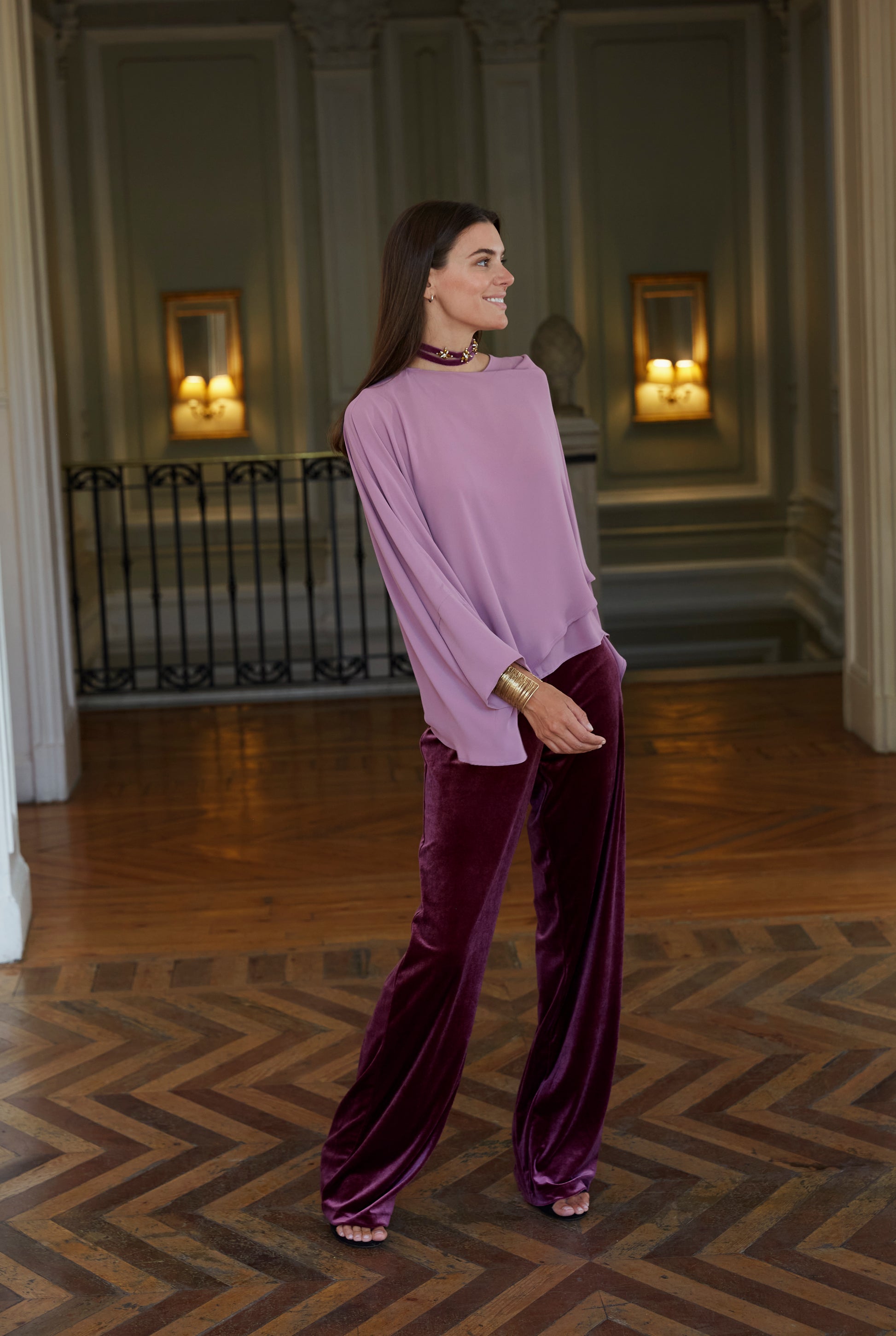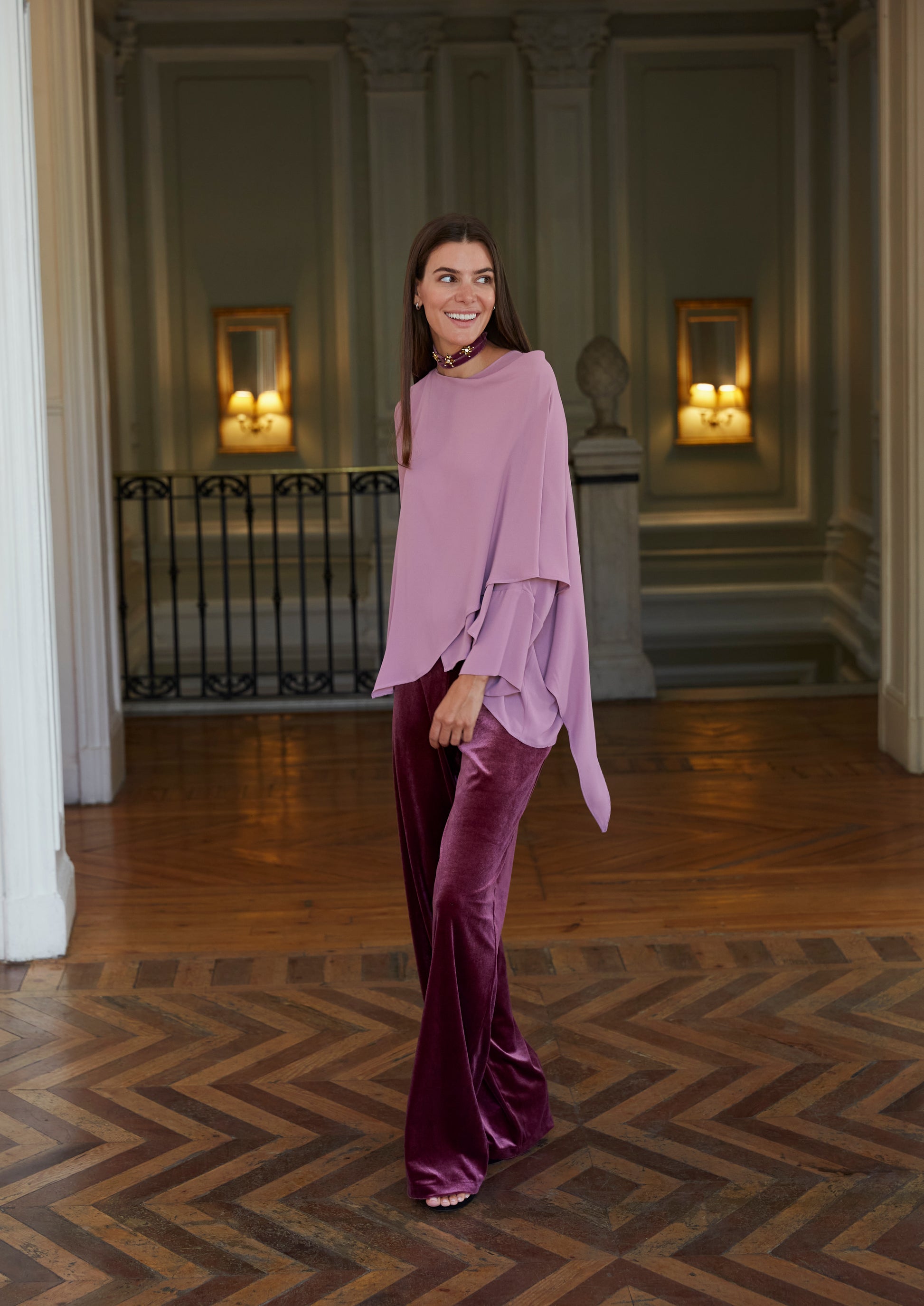 Party set consisting of a multi-position blouse made of crepe and wide-legged trousers made of eggplant pink velvet.