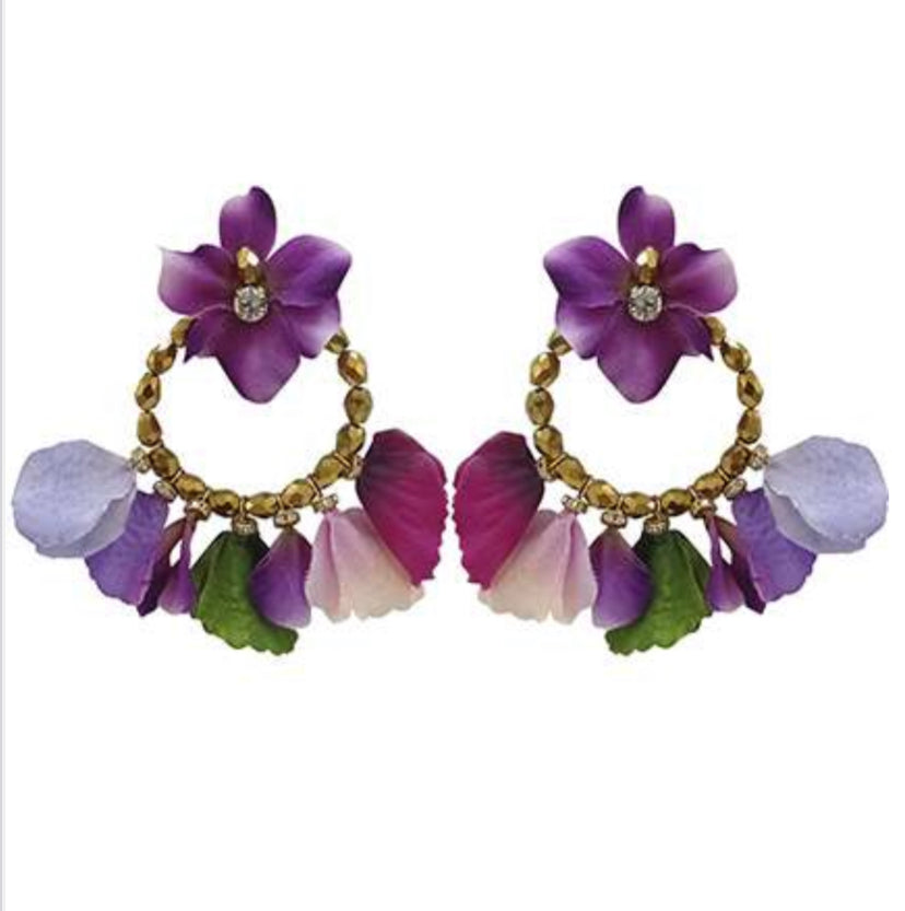 Large gold hoop earring with stones, and fabric flower and petals in purple and green lilac tones. Nut closure. Measurement length 9cm x width 5cm