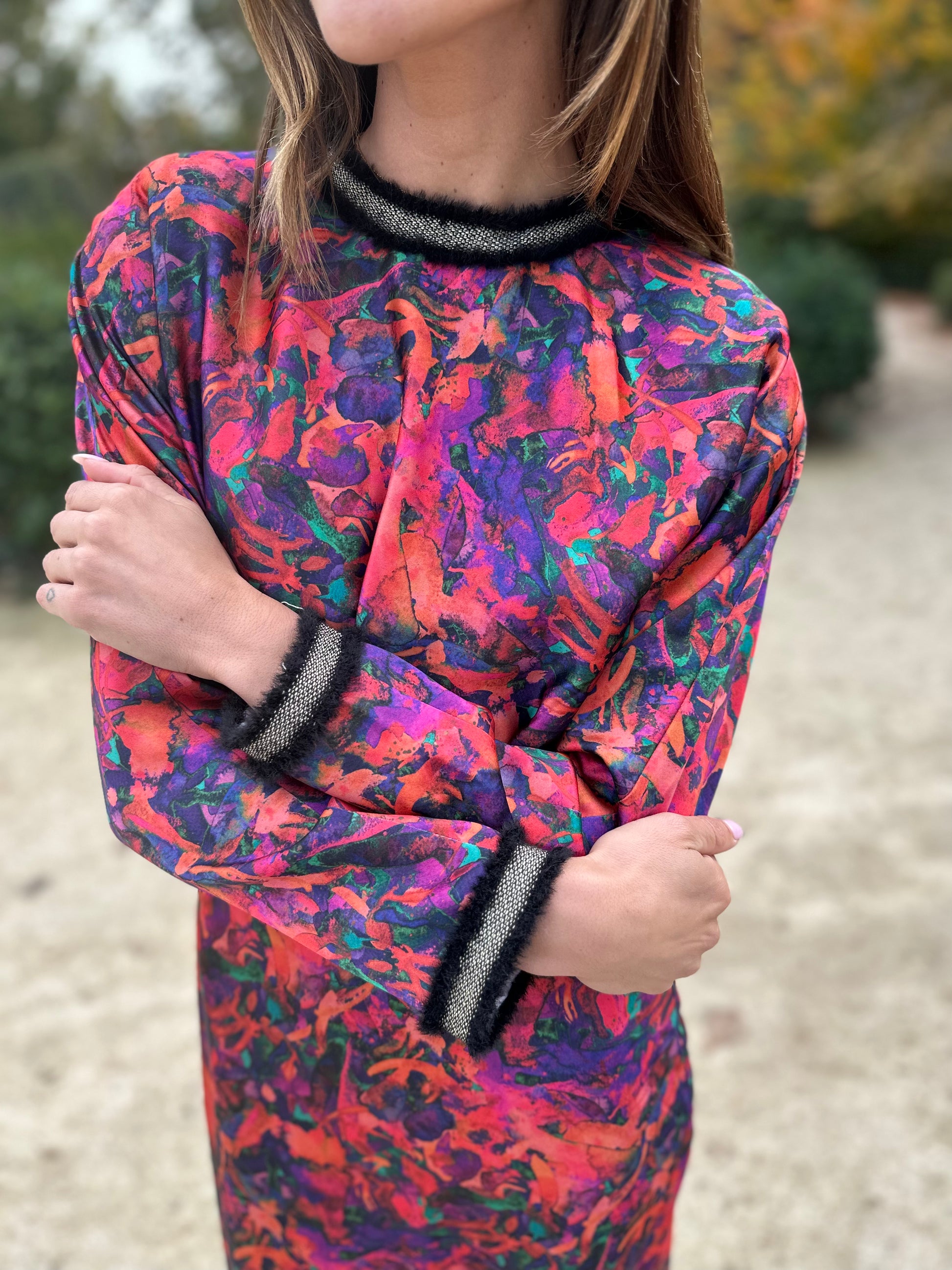 Midi party dress with Japanese sleeves, elastic waist and flared skirt, buttons on the back. Made of multicolored printed satin crepe in brick, purple, coral and navy blue tones, with fringed gimp on the collar and cuffs. Lined dress.