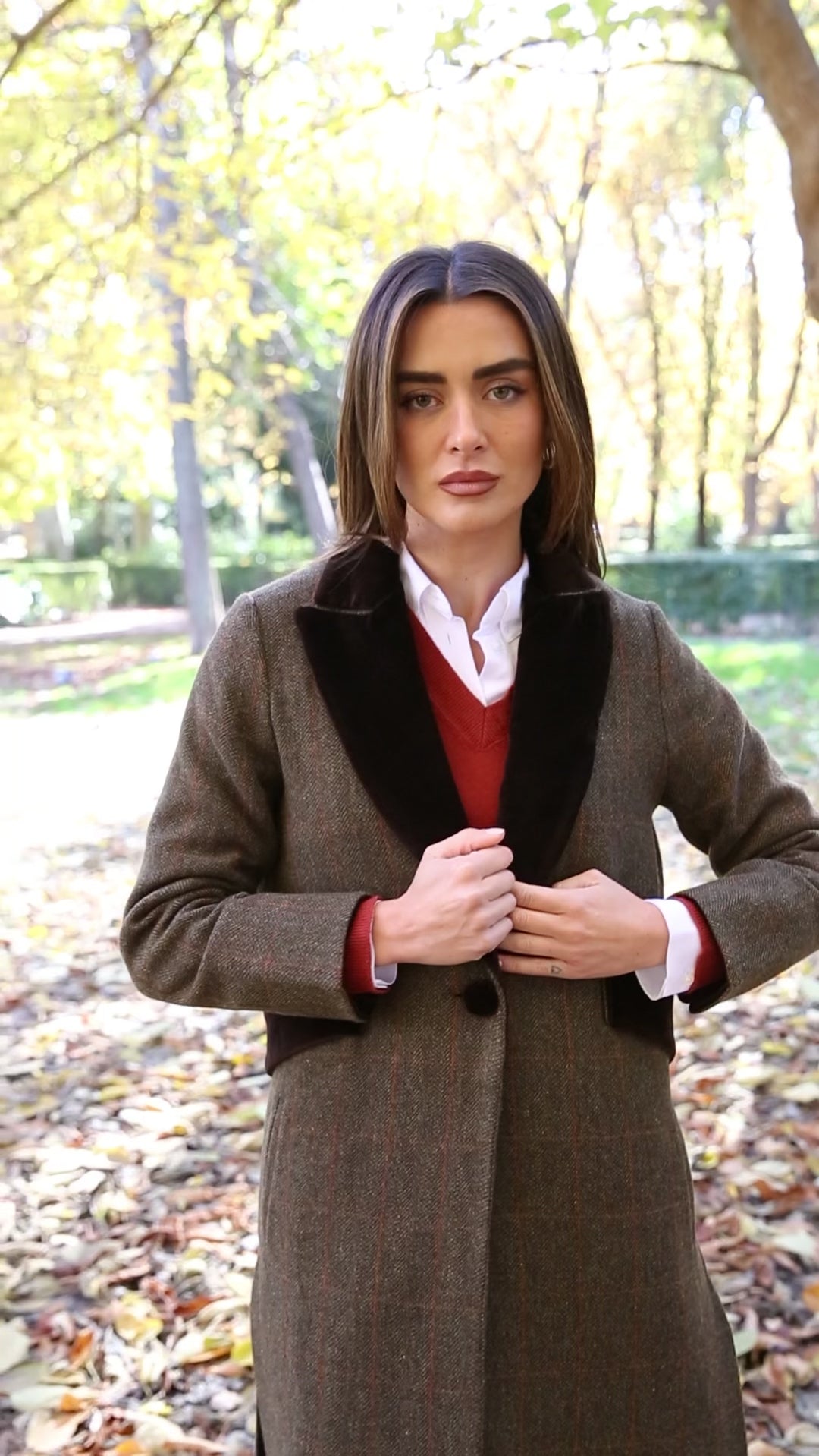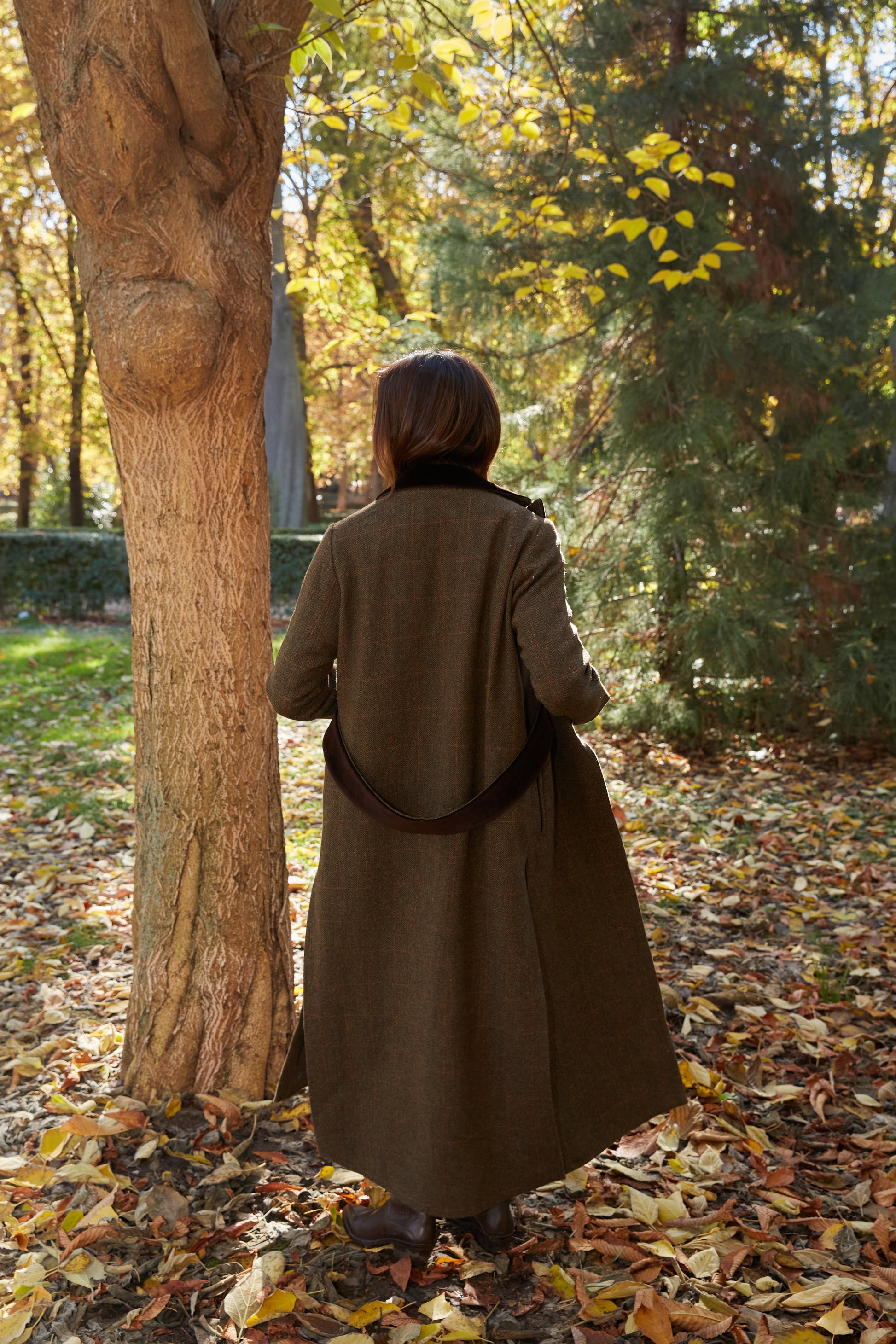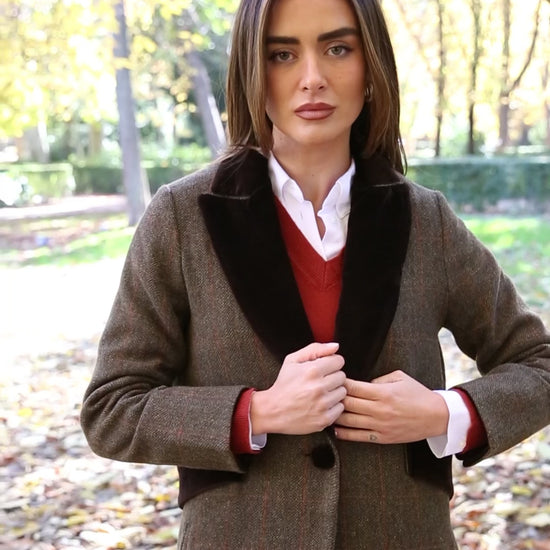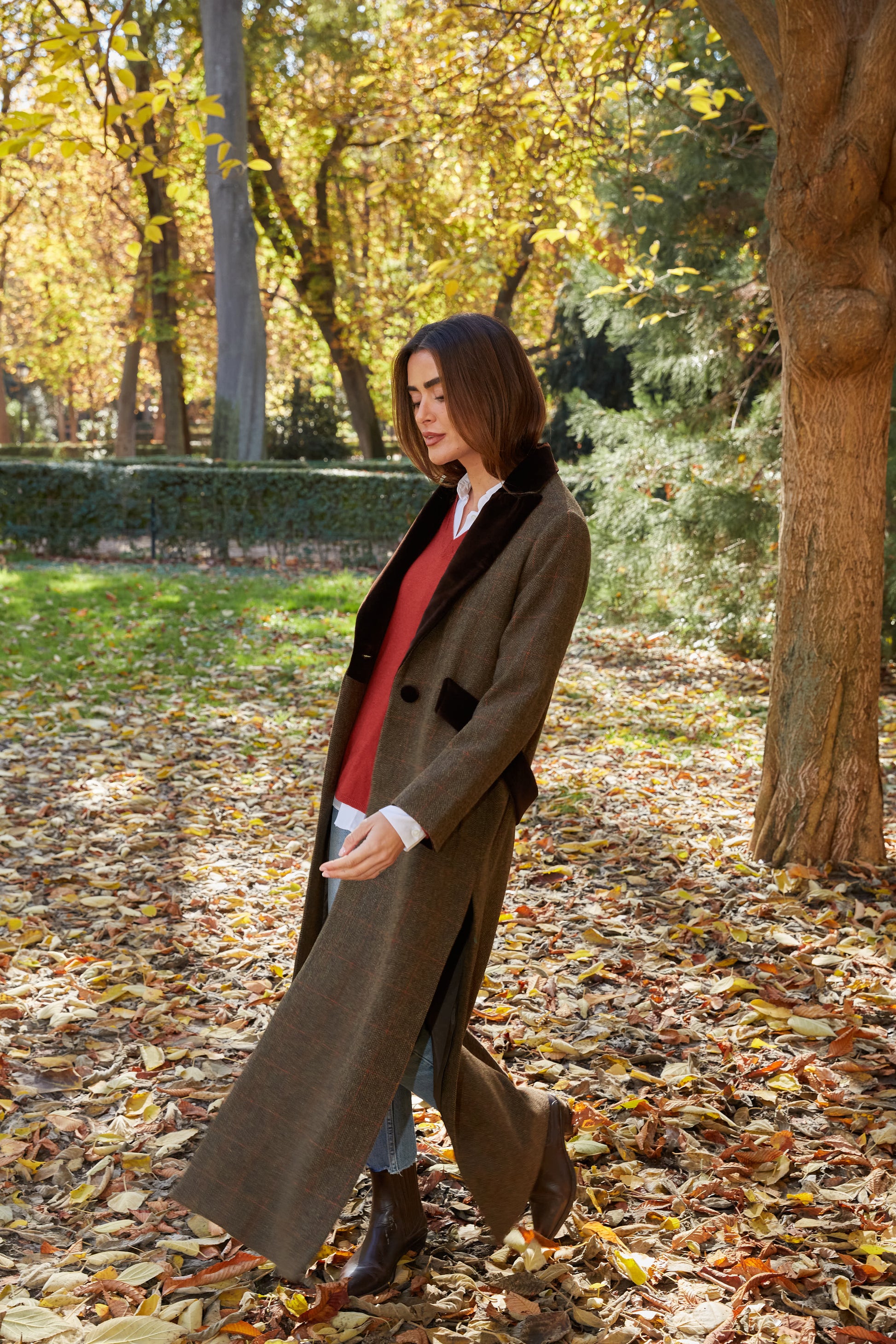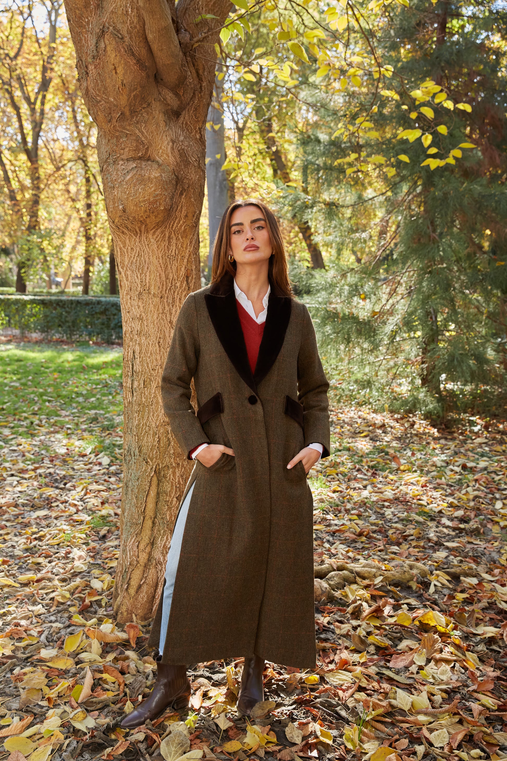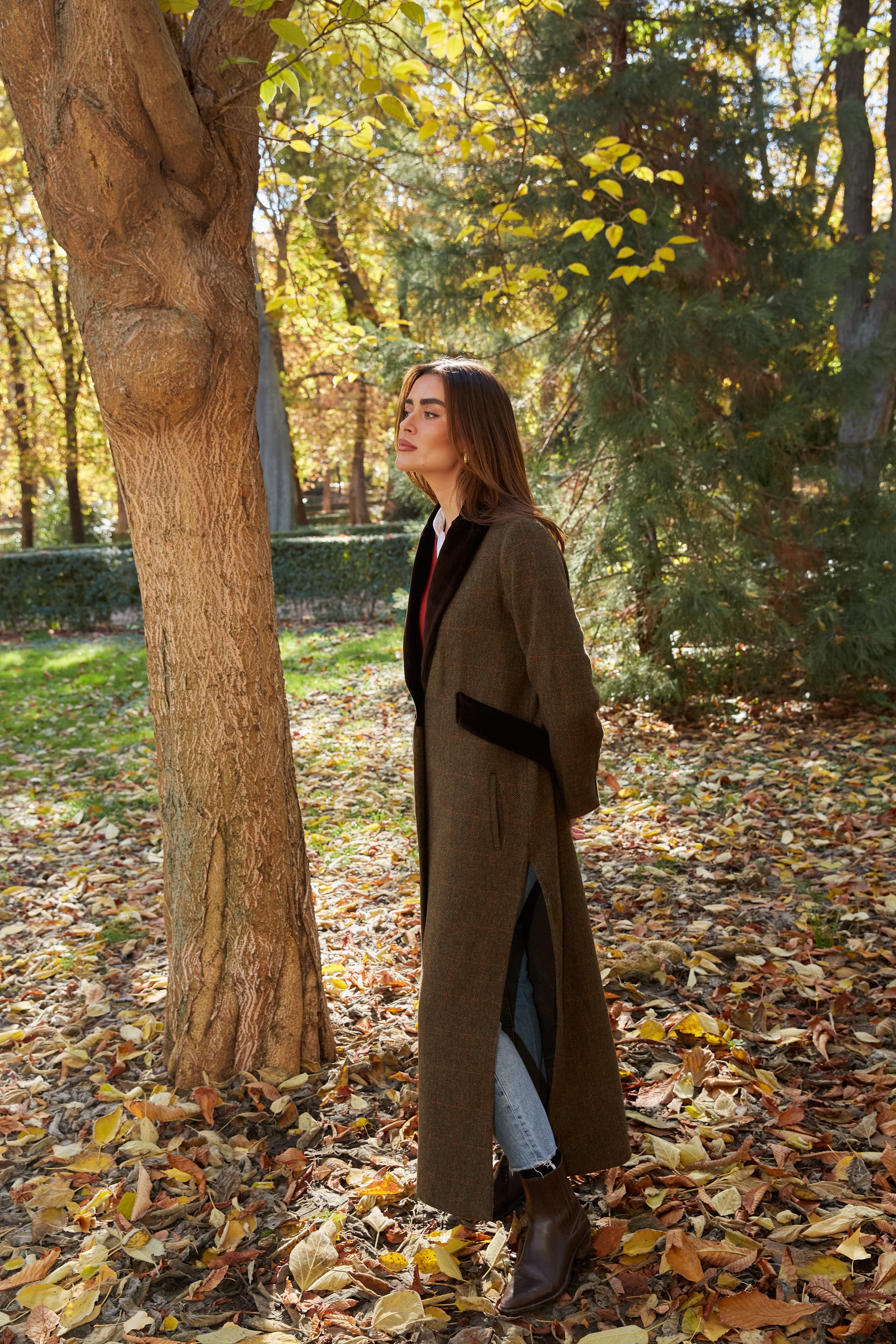 Abrigo largo de lana espiga marrón y verde kaki con detalles de terciopelo de algodón en color marrón en solapas, cinturón y puños. Tipo levita con cuello de solapa y largas aberturas laterales. Con bolsillos. Abrigo forrado.