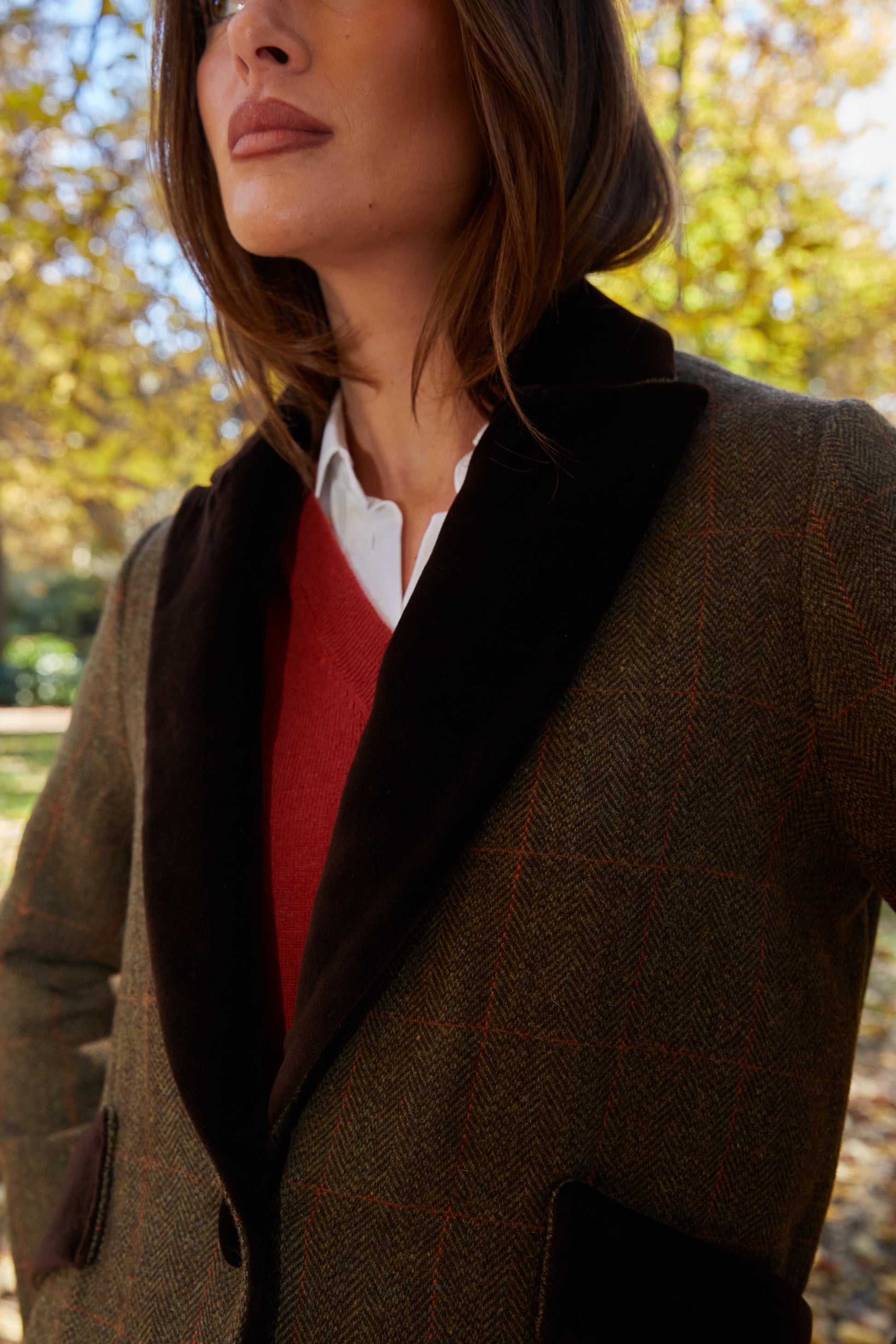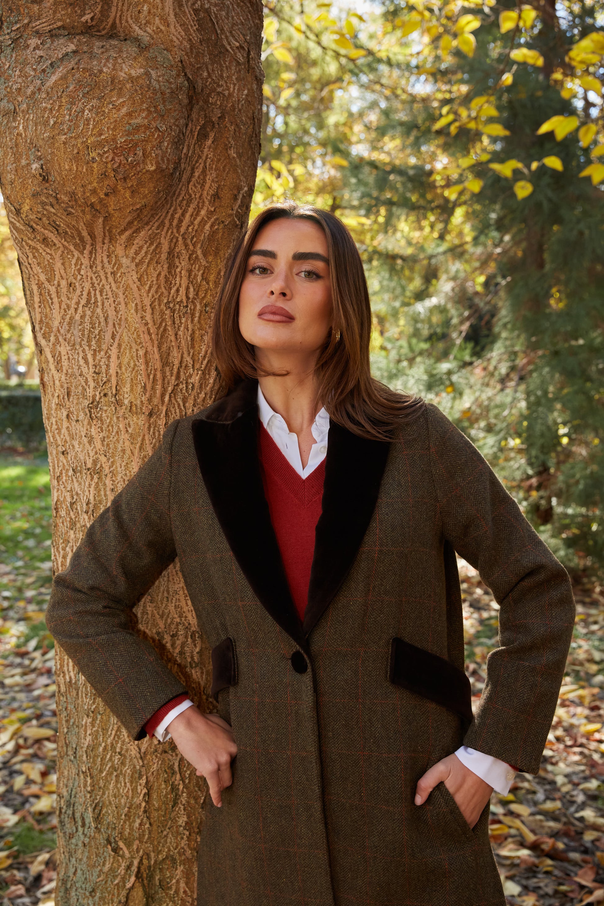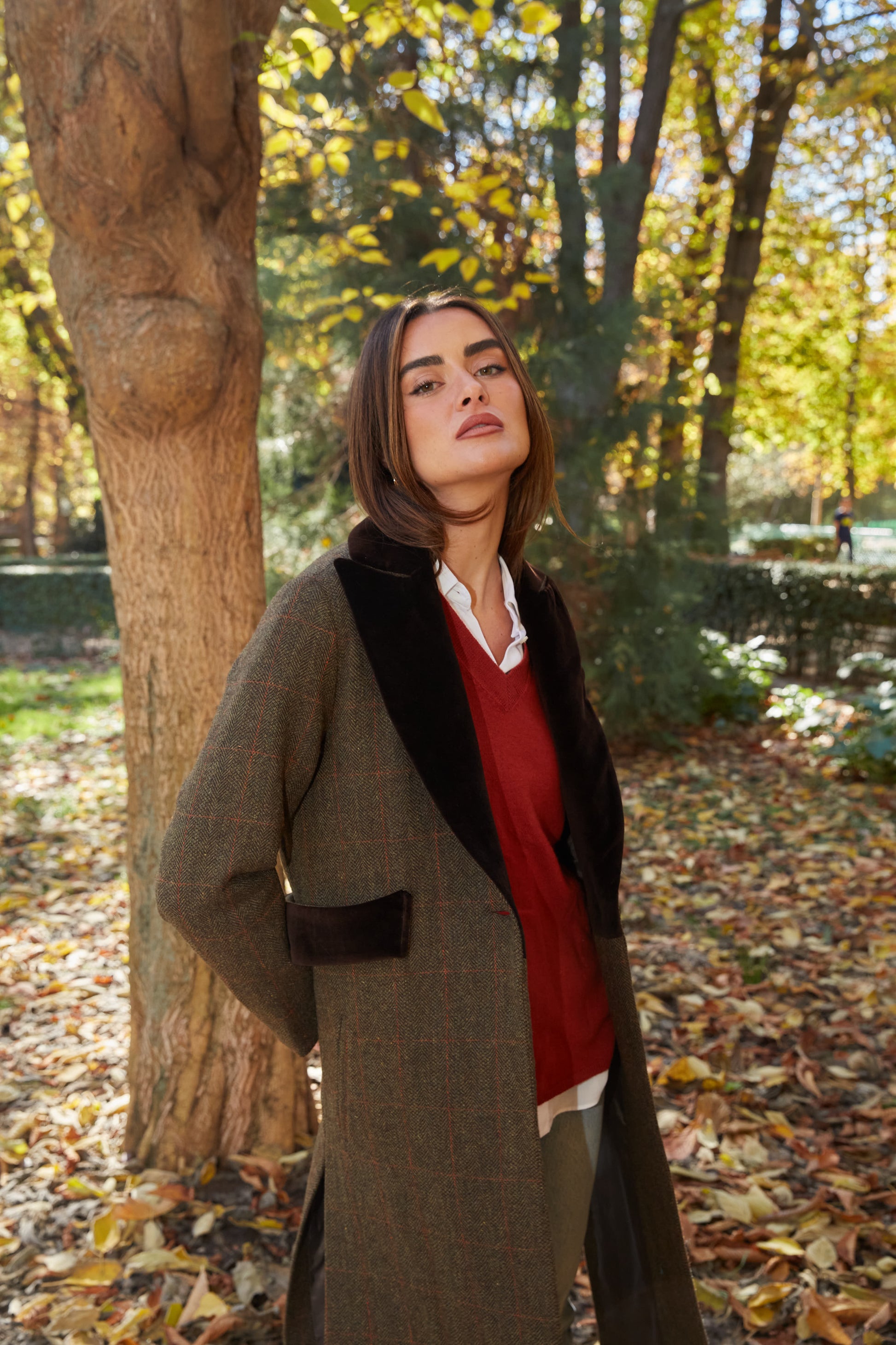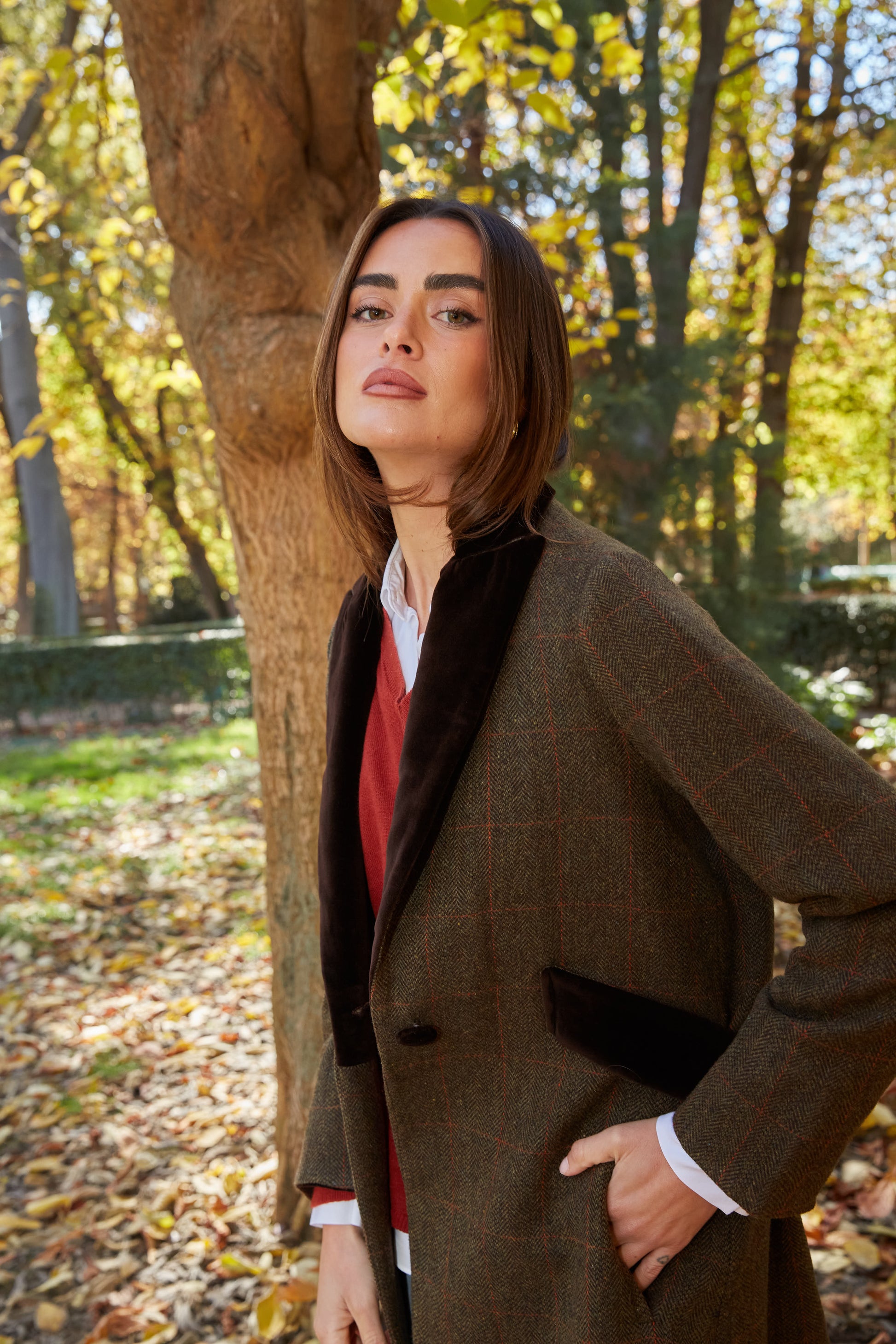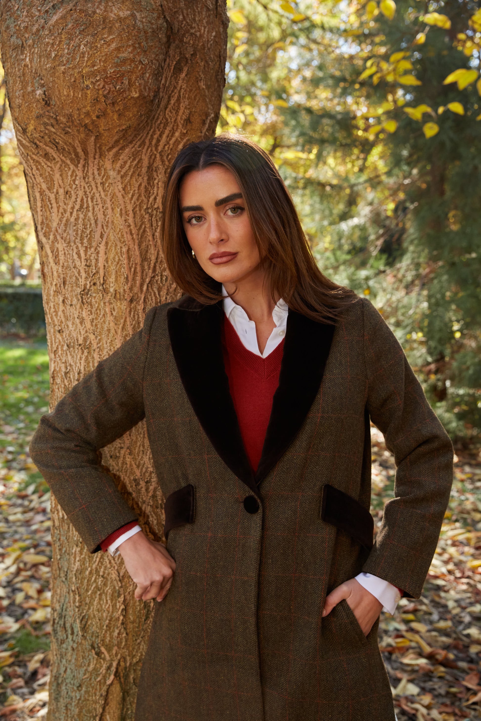 Abrigo largo de lana espiga marrón y verde kaki con detalles de terciopelo de algodón en color marrón en solapas, cinturón y puños. Tipo levita con cuello de solapa y largas aberturas laterales. Con bolsillos. Abrigo forrado.