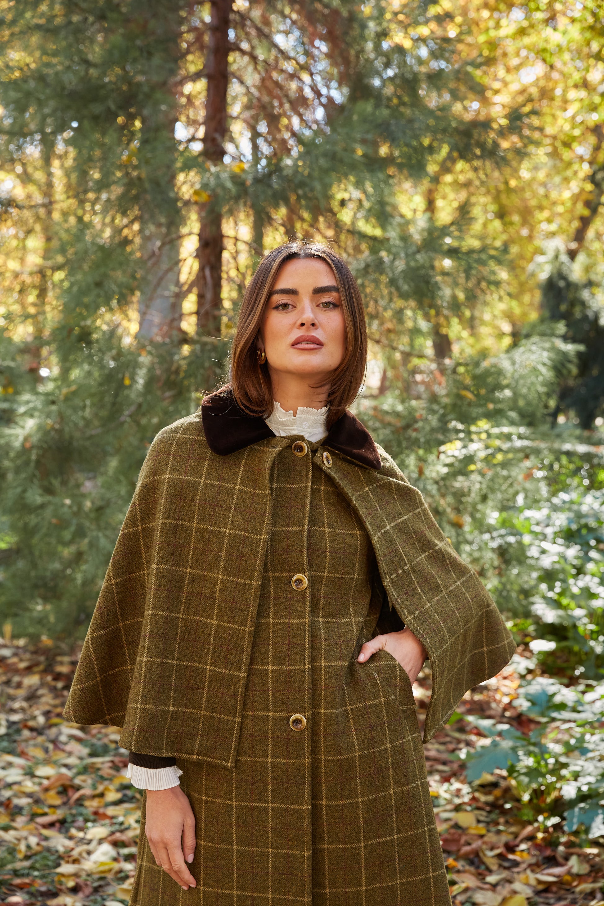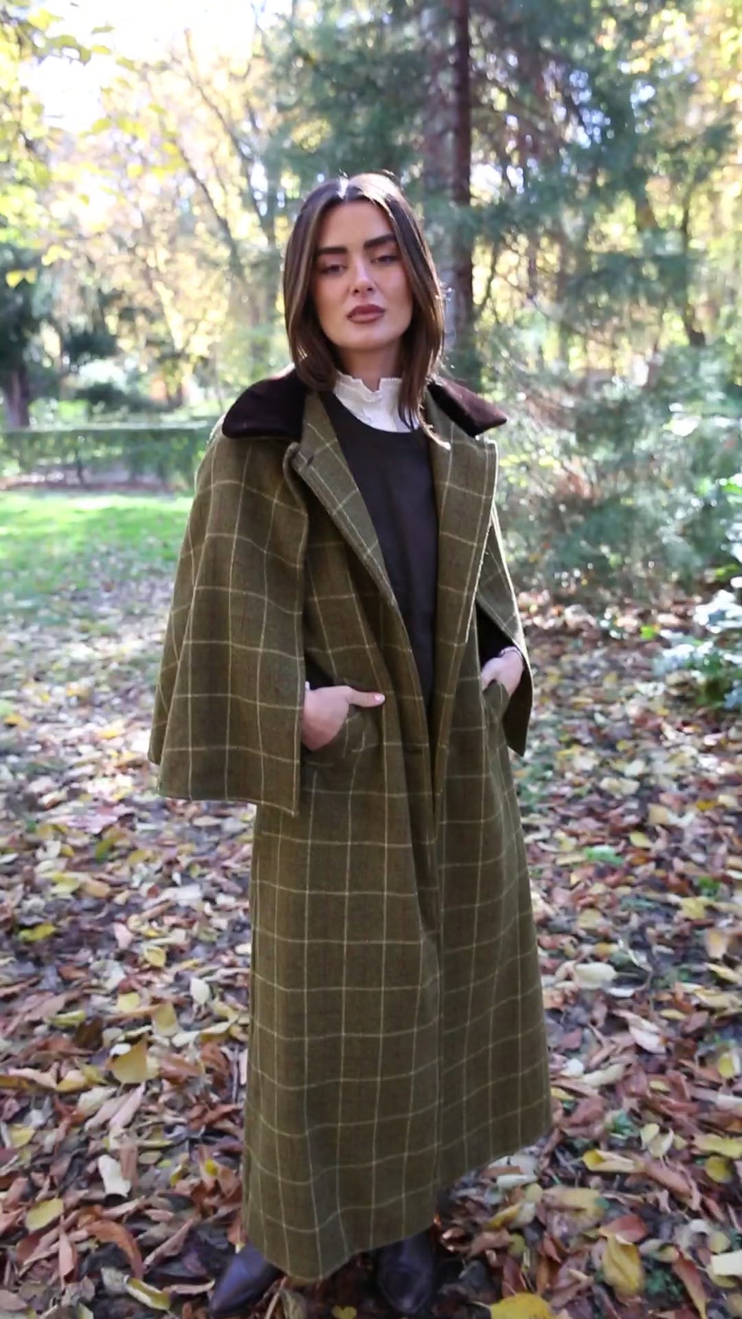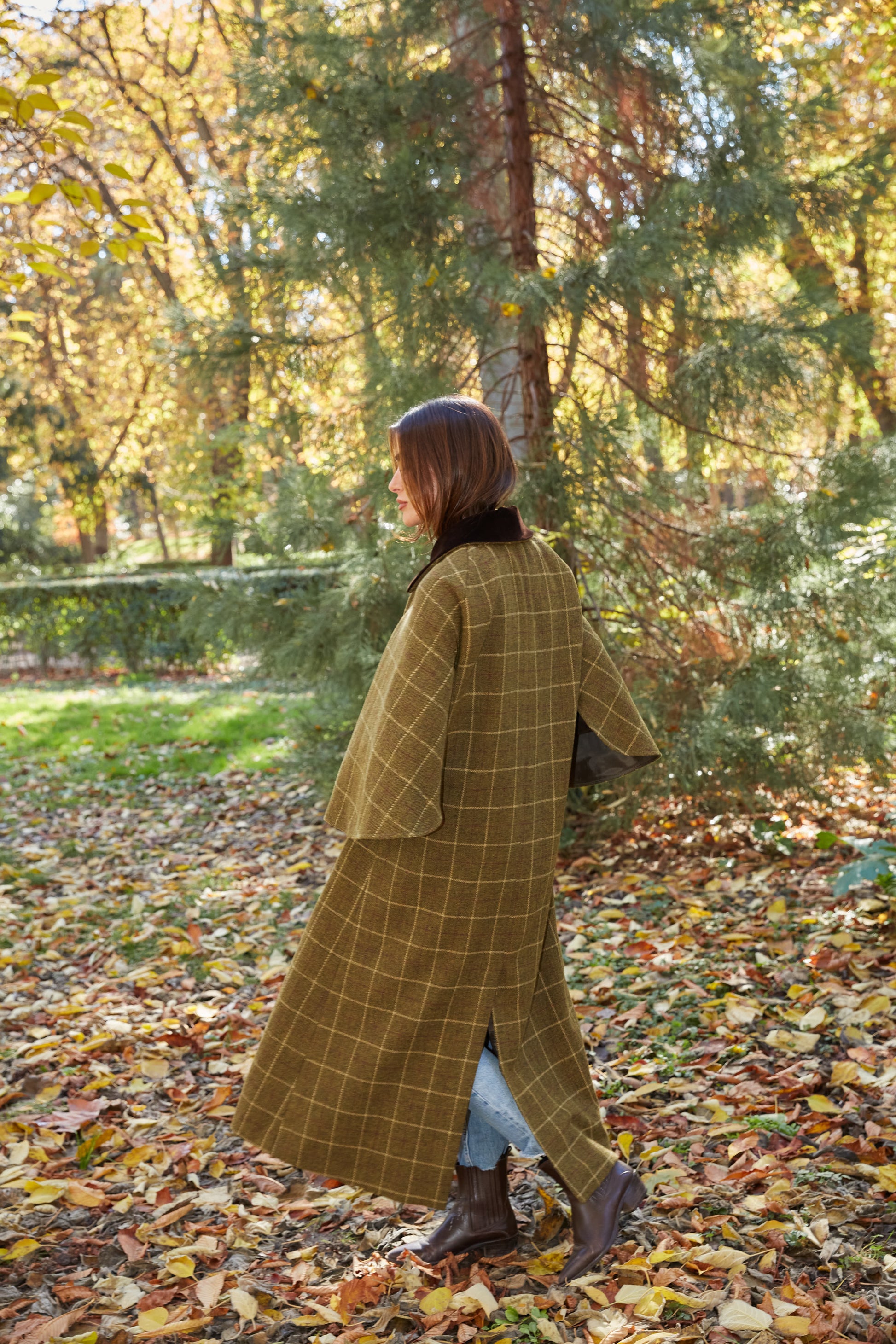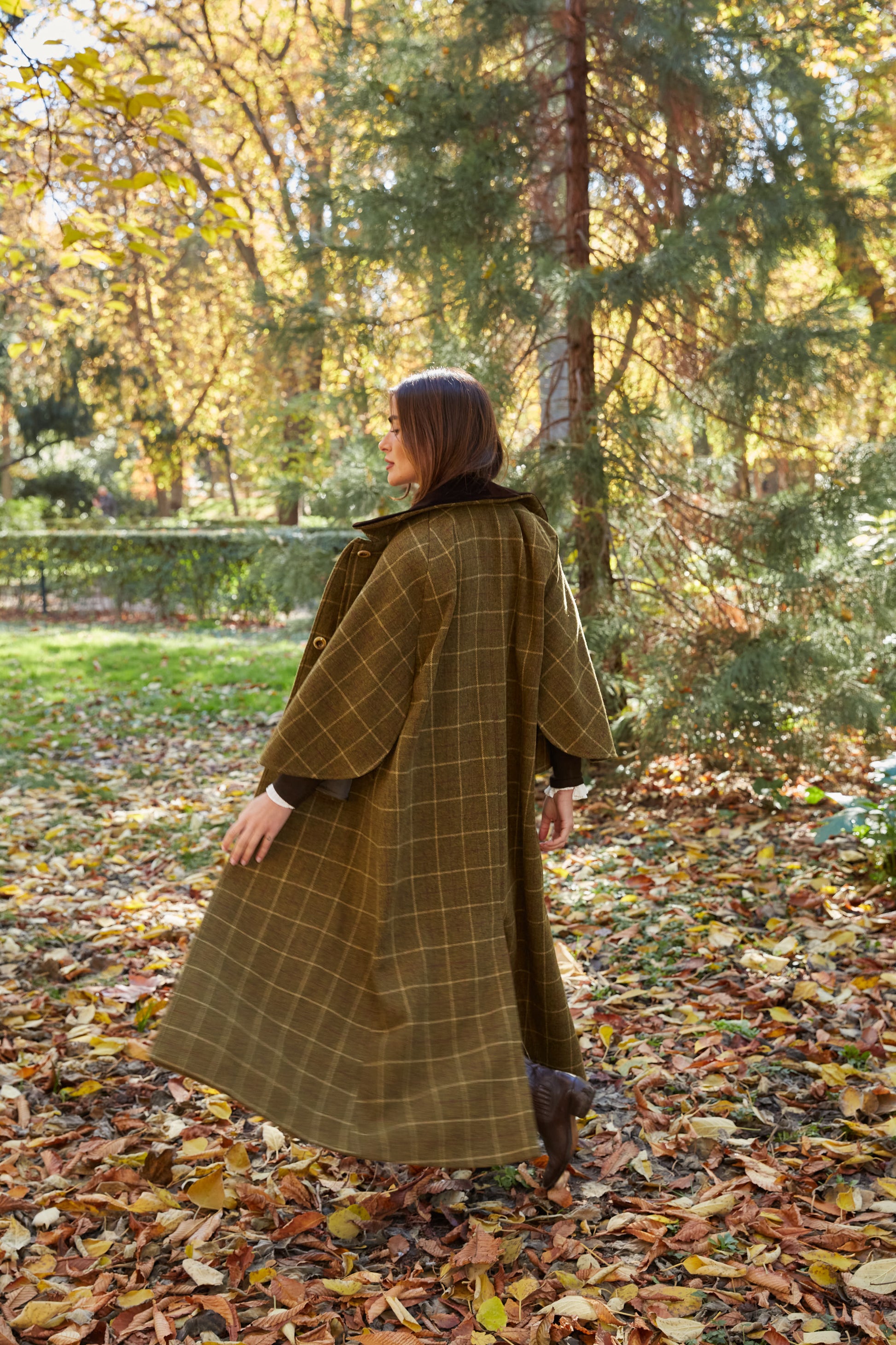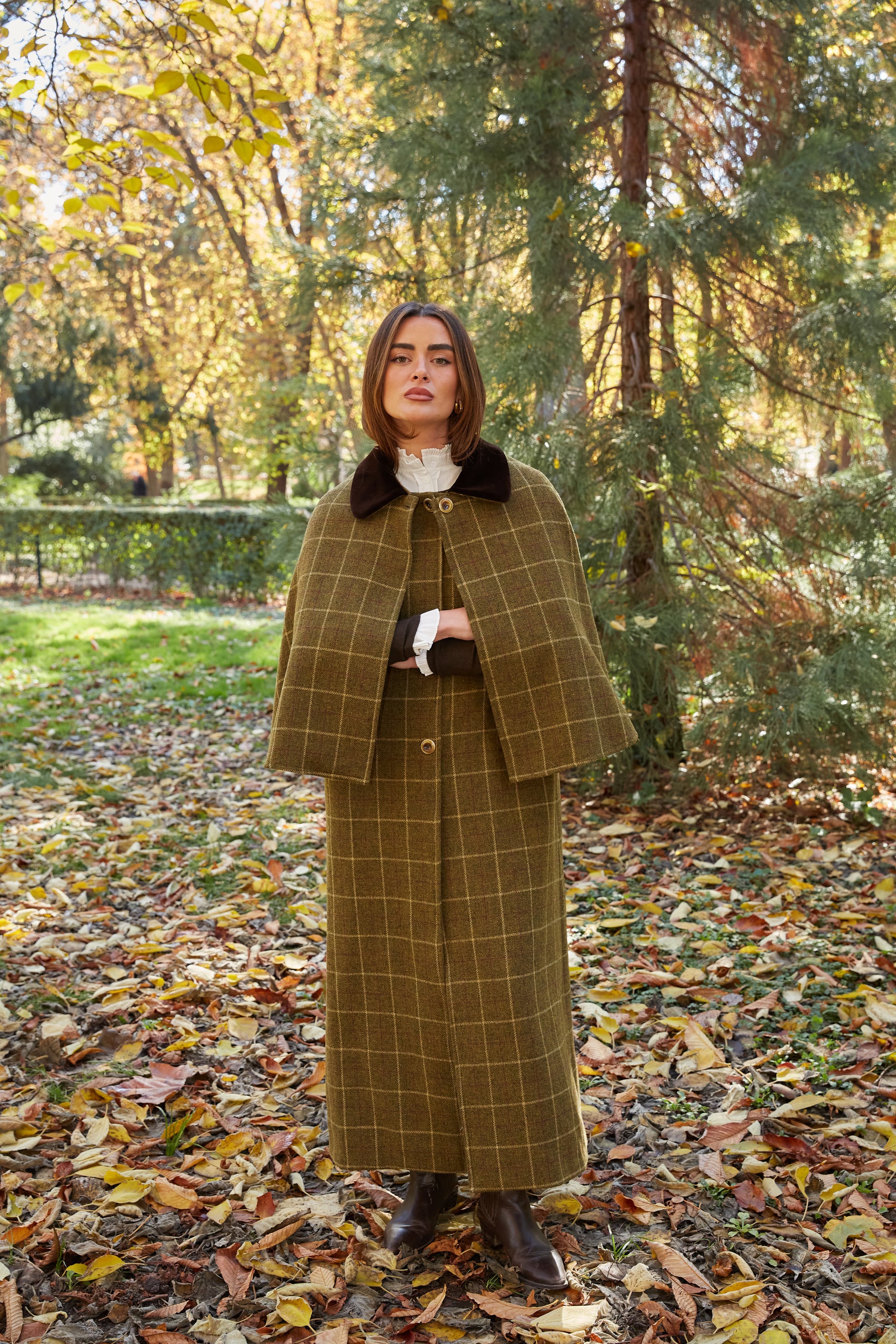 Abrigo tipo capa largo de lana con cuadros tono verde oliva con cuello de terciopelo de algodón en color marrón. Capa en delantero y mangas. Con bolsillos. Abrigo forrado.