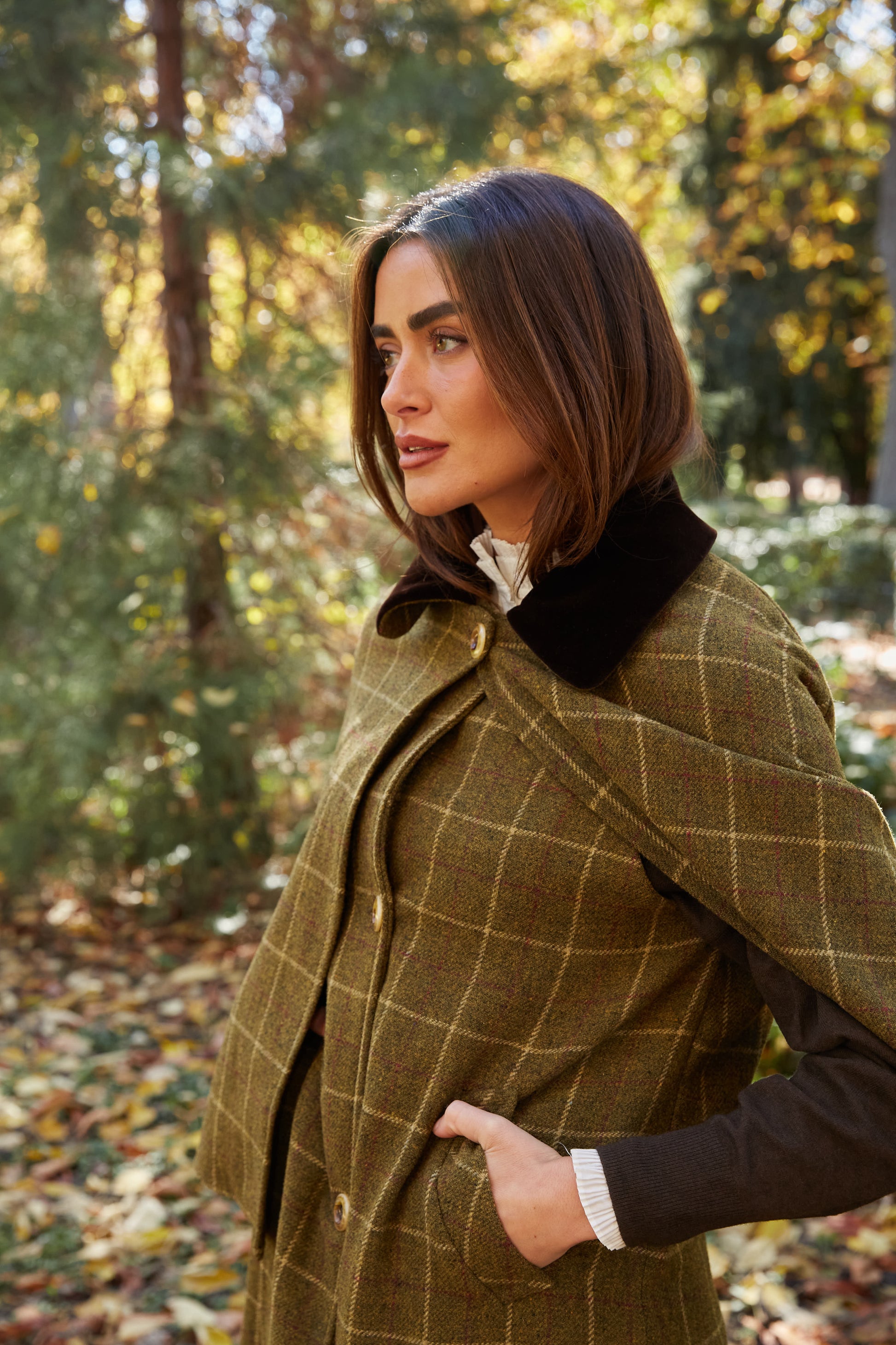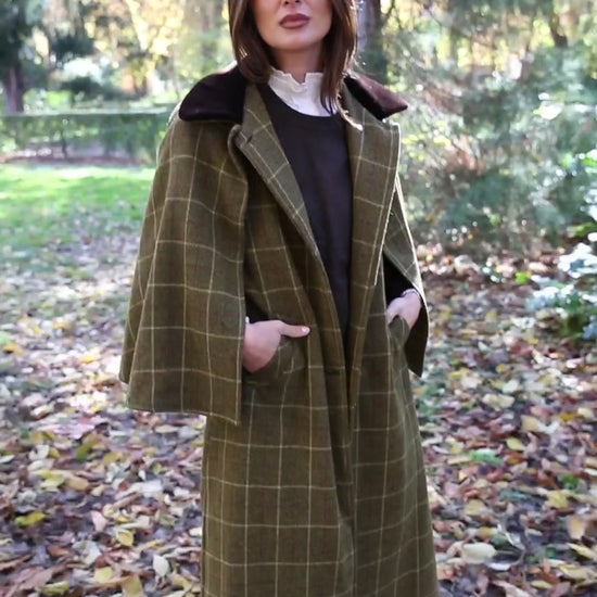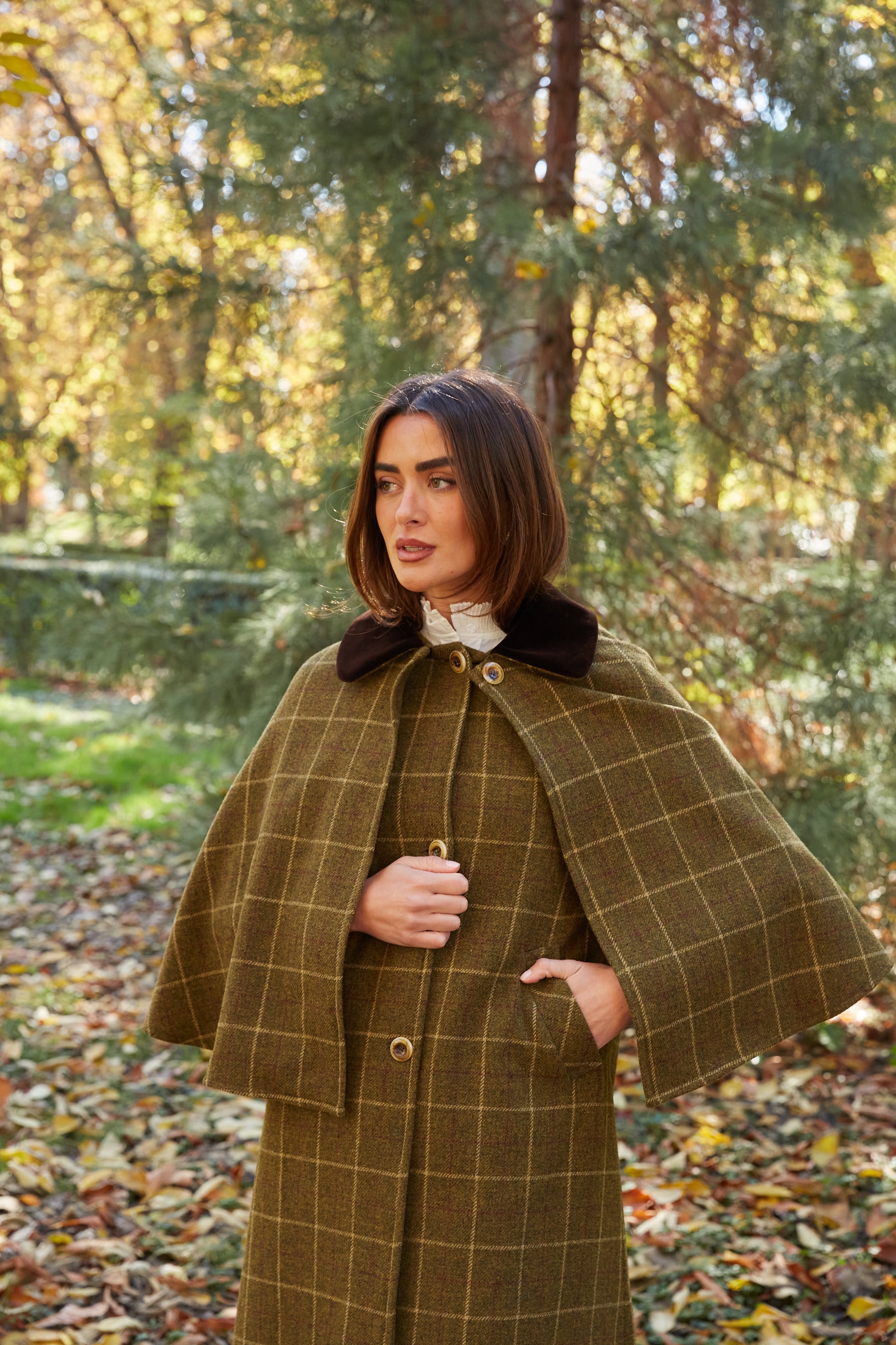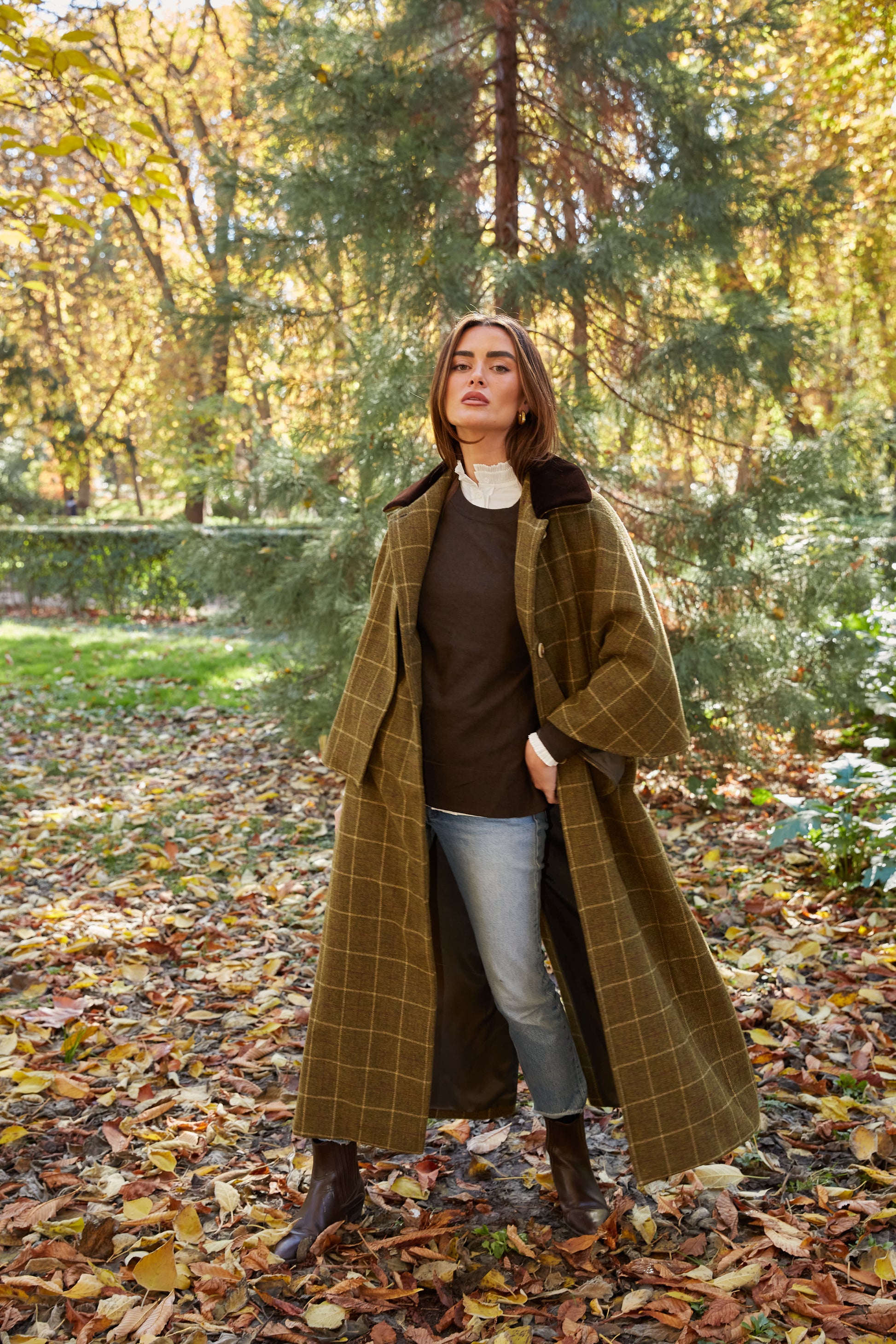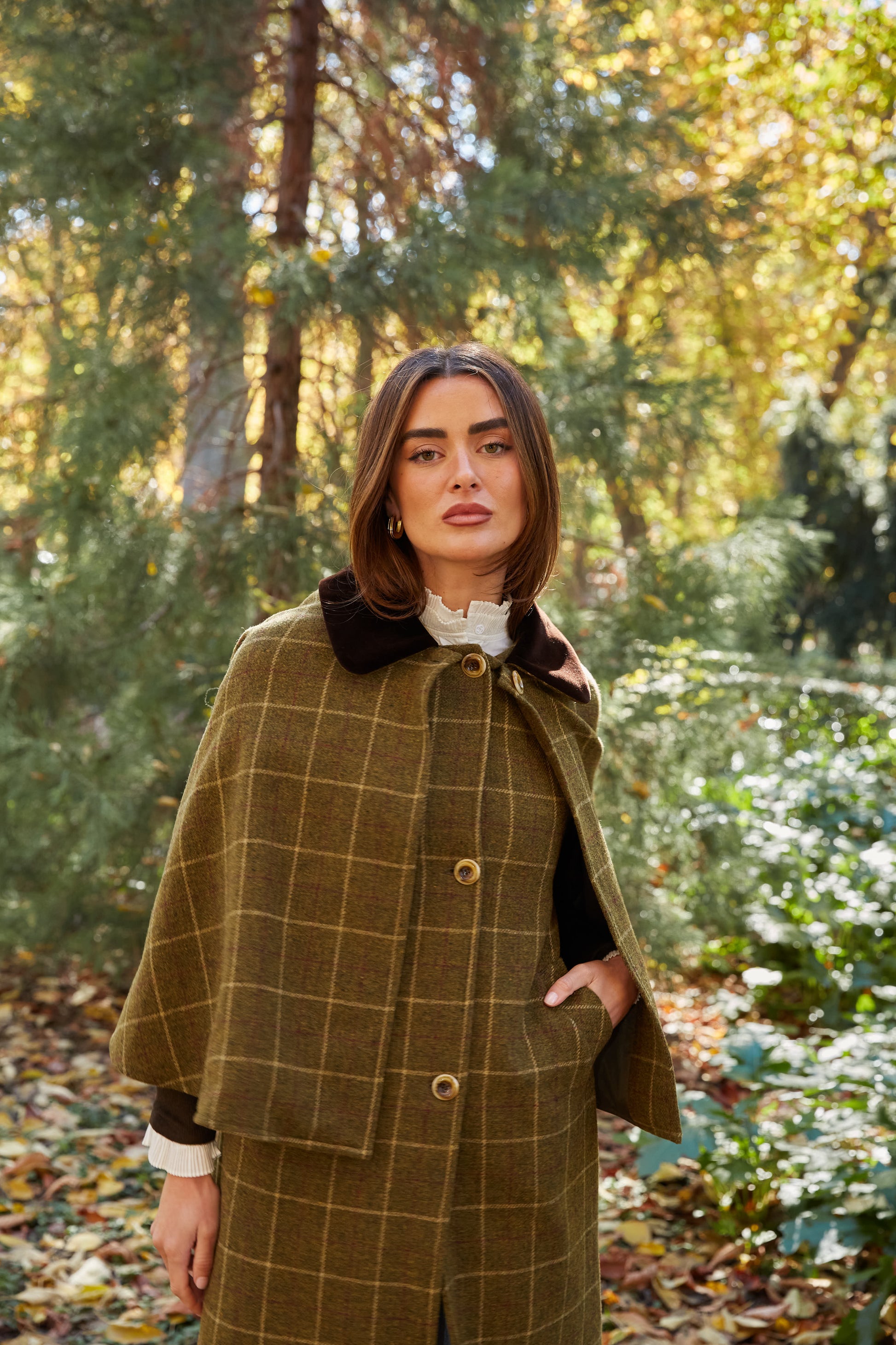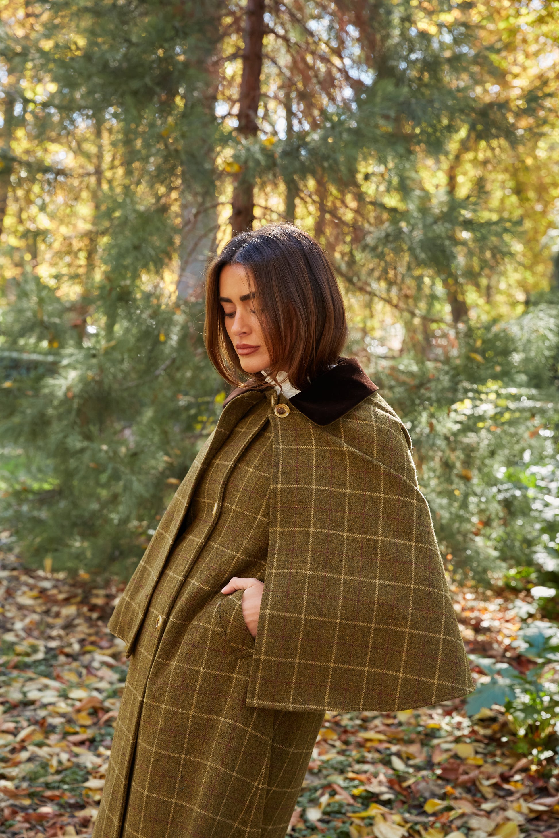 Abrigo tipo capa largo de lana con cuadros tono verde oliva con cuello de terciopelo de algodón en color marrón. Capa en delantero y mangas. Con bolsillos. Abrigo forrado.