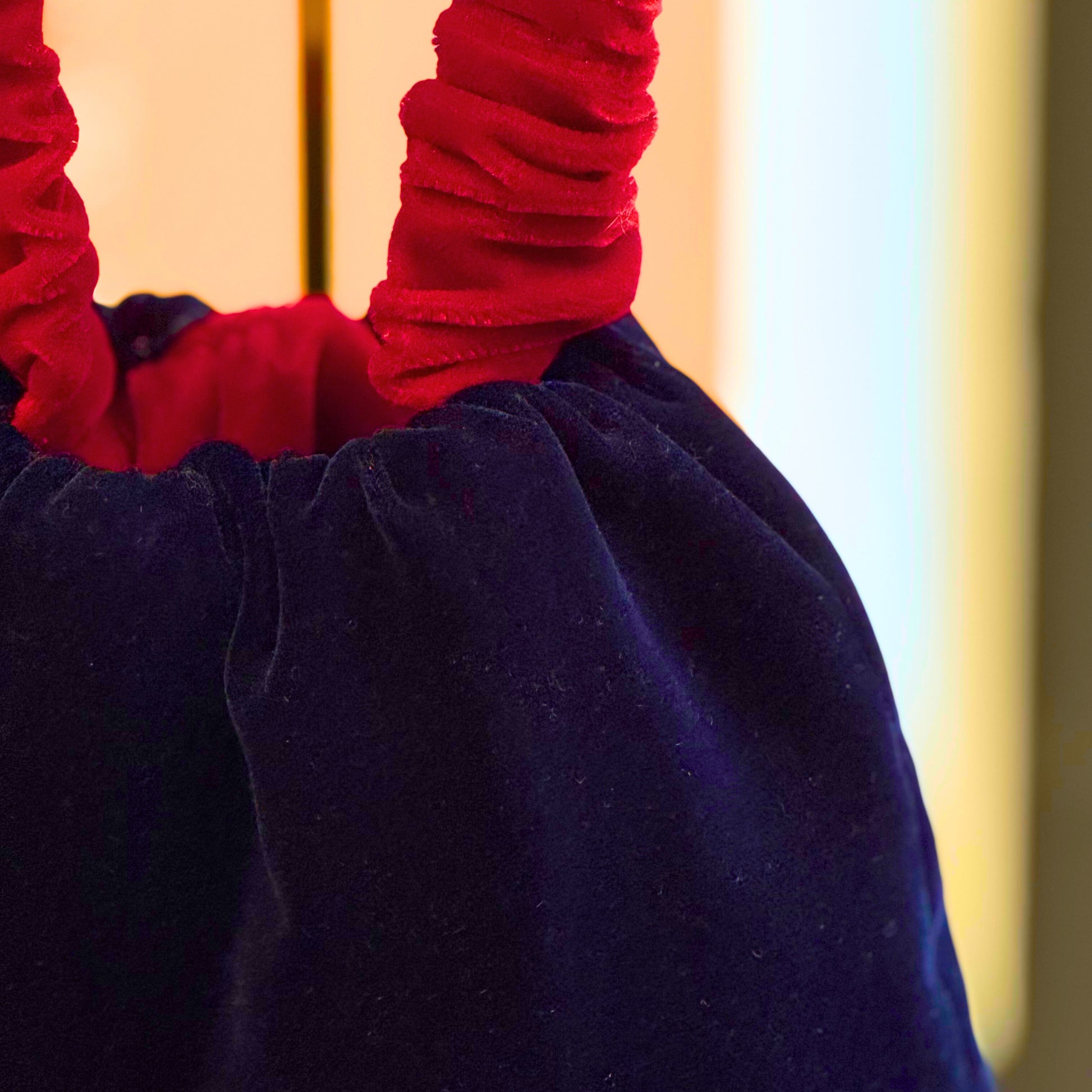 Reversible, combina un lado en terciopelo azul marino, sereno y sofisticado, con otro en terciopelo rojo intenso, lleno de carácter.