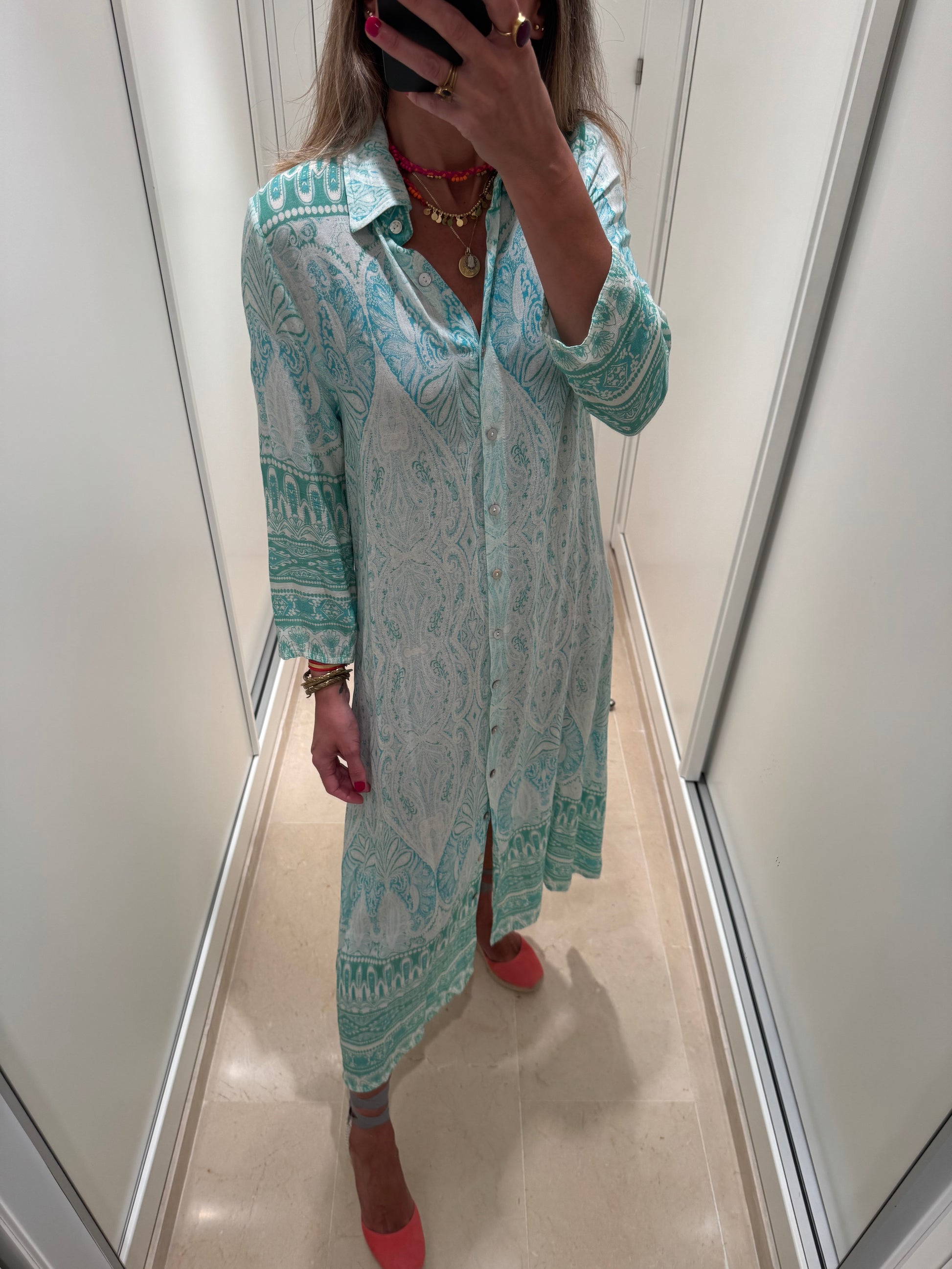 Vestido camisero largo tobillo, con botoncitos de nácar. Con bolsillos laterales. Confeccionado en tejido de viscosa estampado cachemir verde agua.