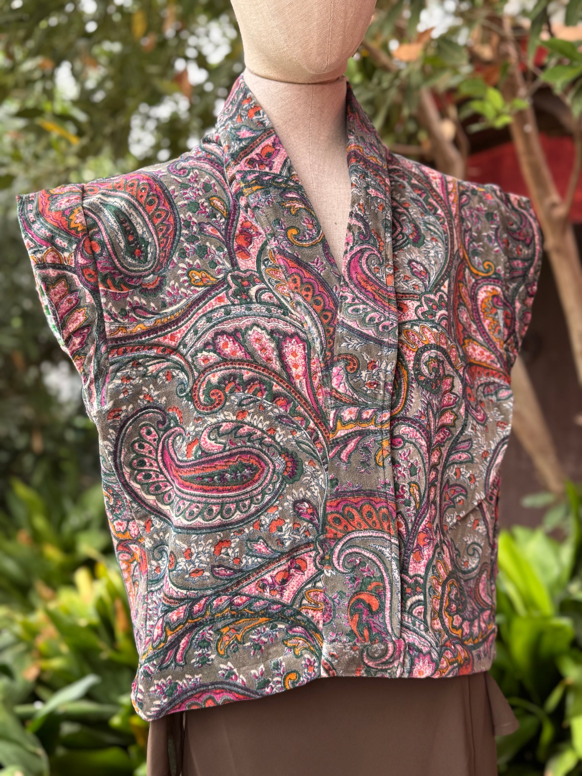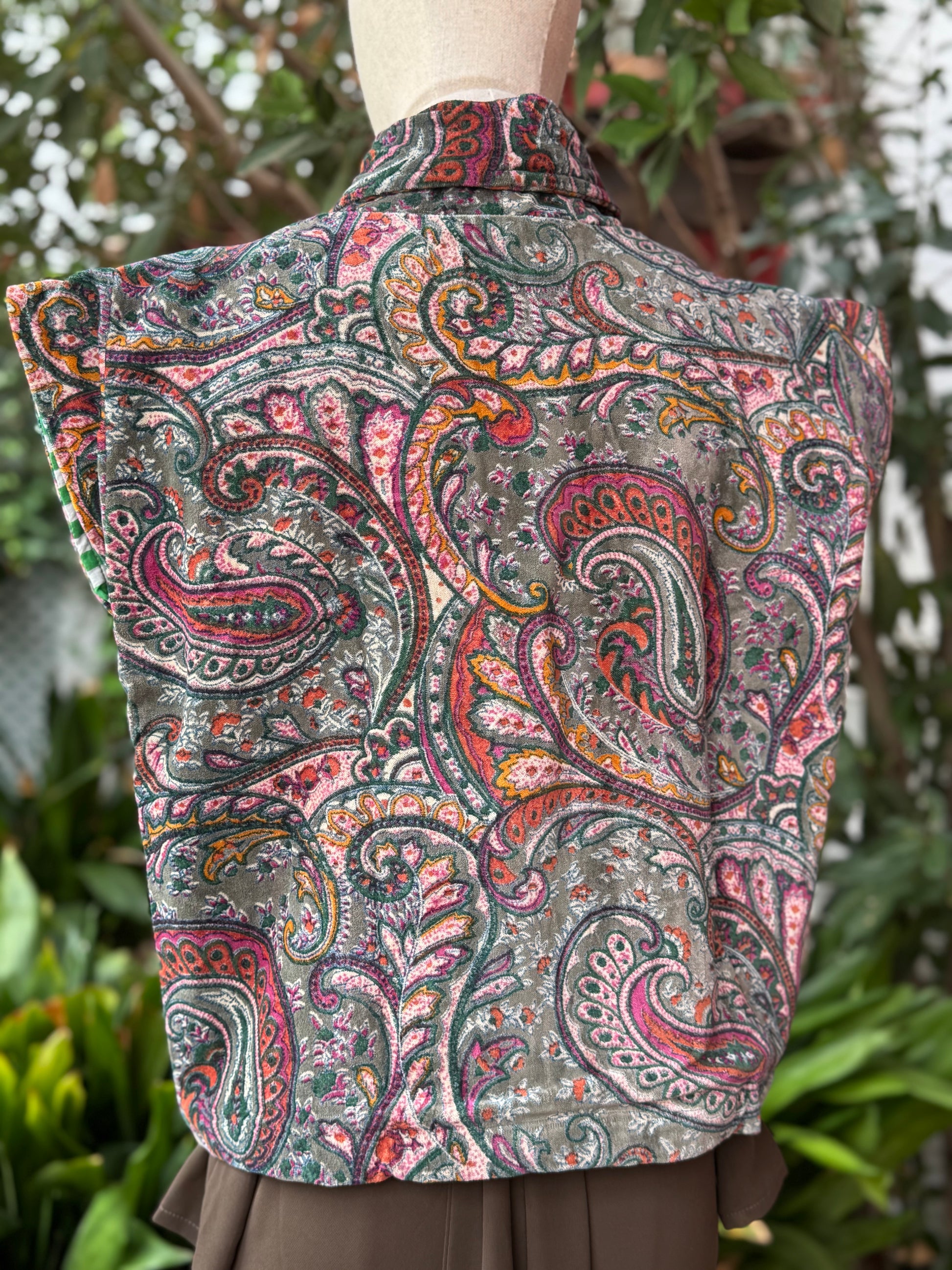 Chaleco de terciopelo de algodón color verde estampado cachemir, chaleco forrado.
