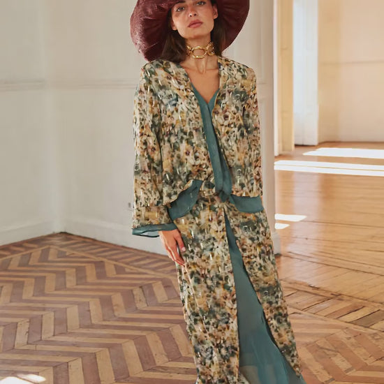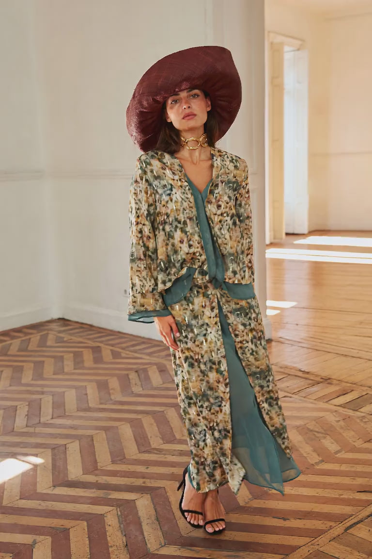 Conjunto de Fiesta midi, blusa escote de pico y manga larga acampanada. Falda con abertura central. Confeccionado en crepe estampado con punto dorado en tonos aguas verde con fina gasa verde que asoma por debajo. Conjunto forrado.