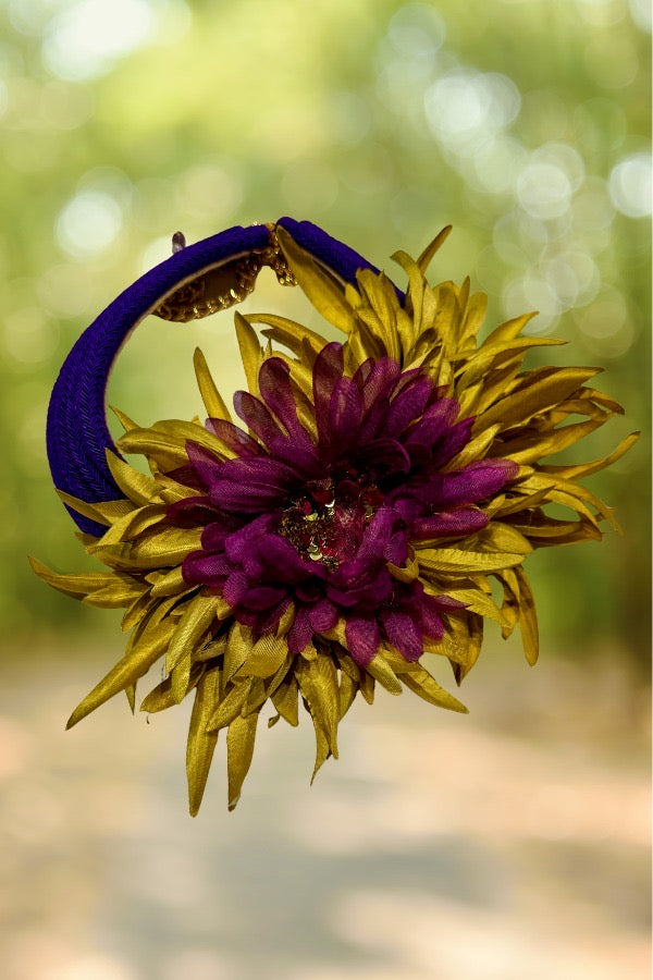 Gargantilla de cordón morado con flores de tela en color oliva y buganvilla. Se ata por detrás con cinta de terciopelo.