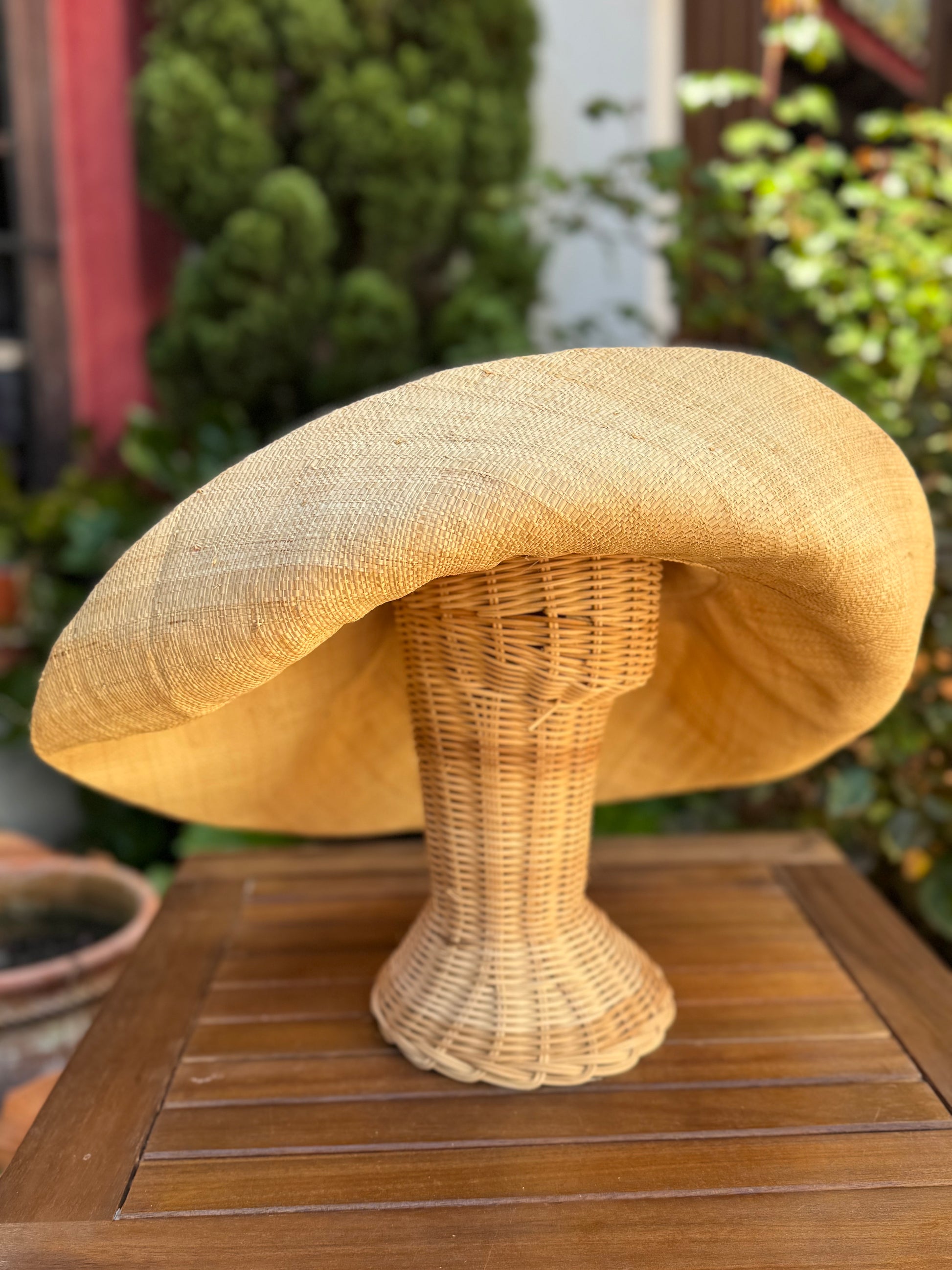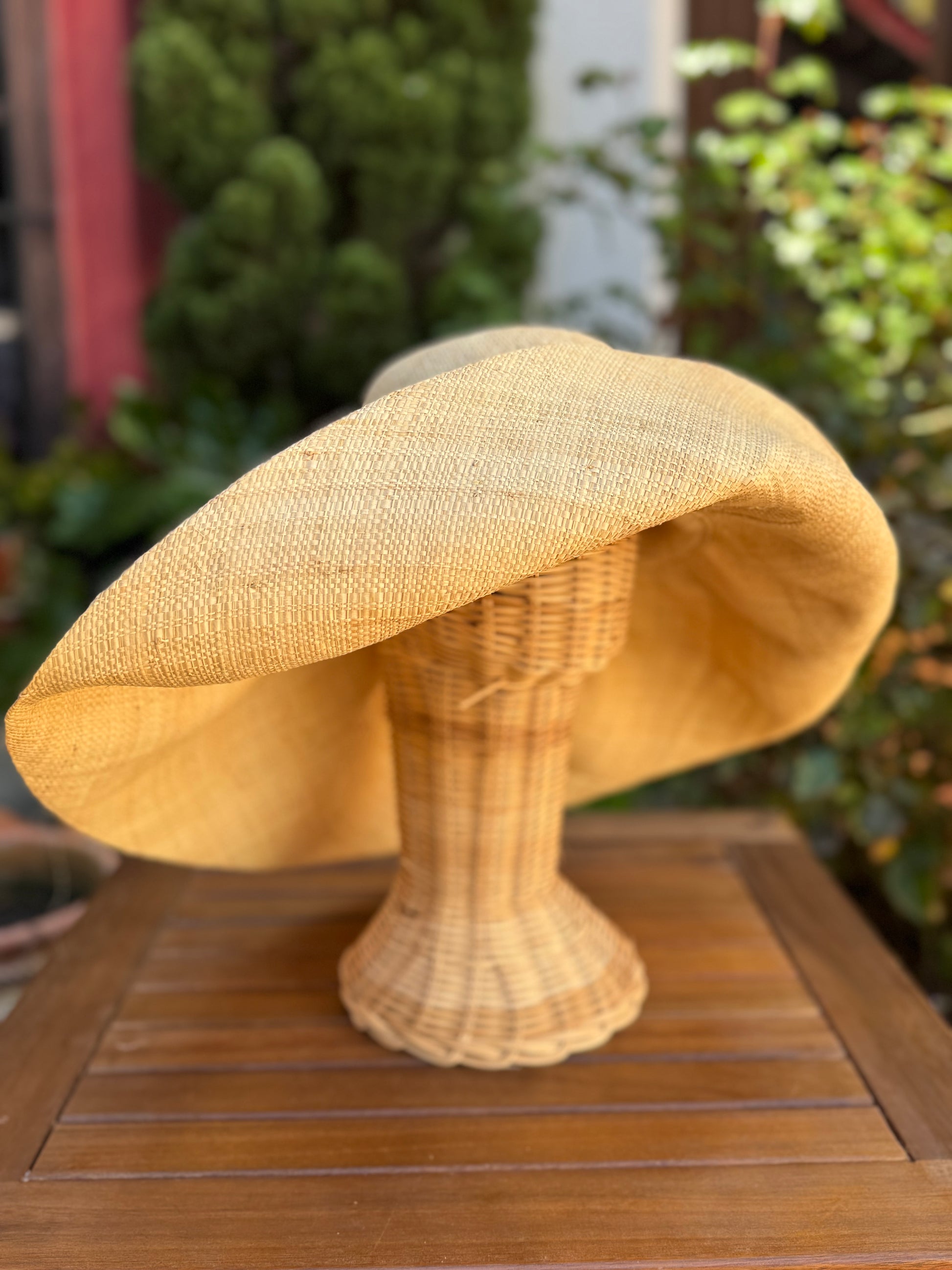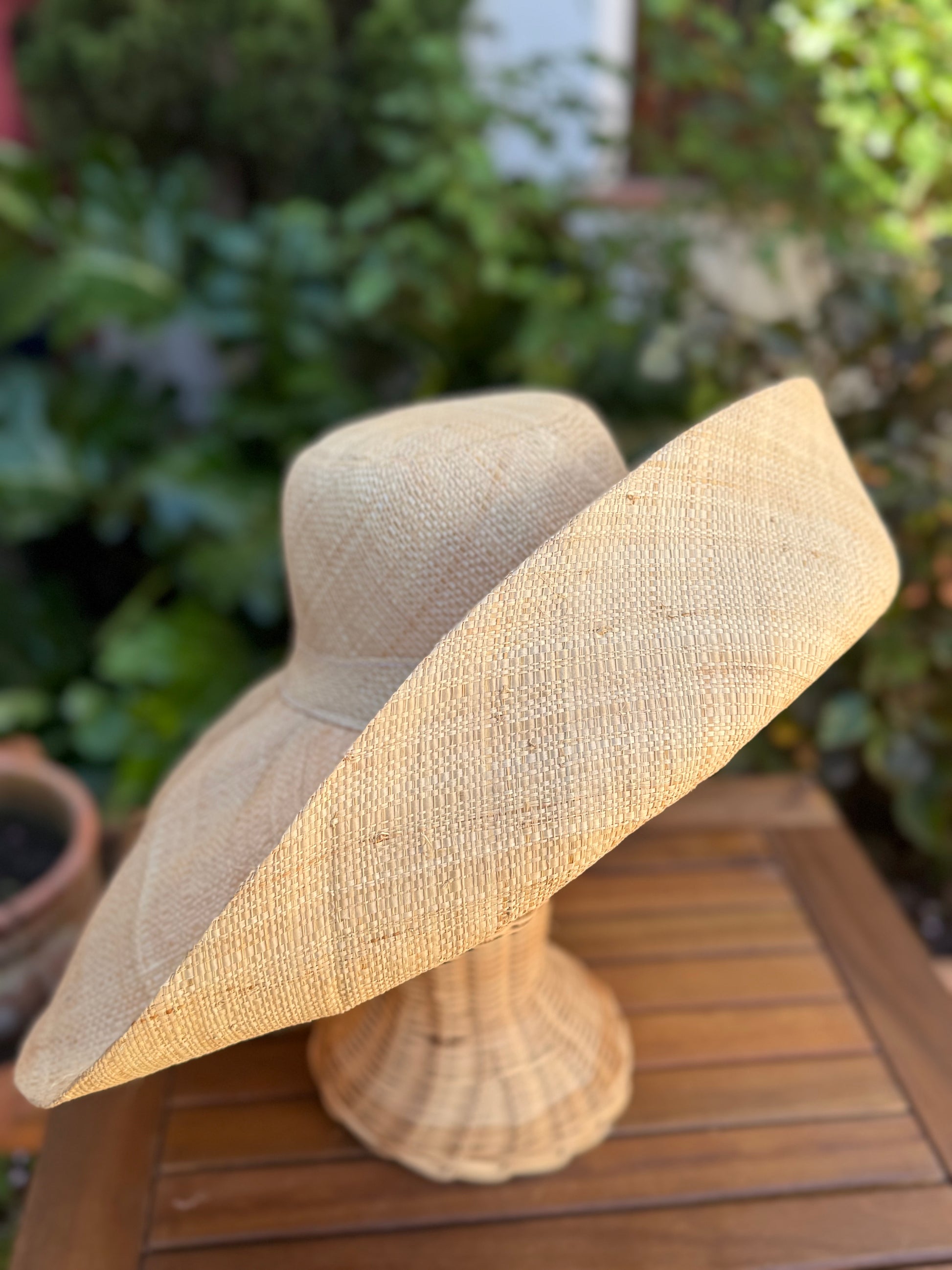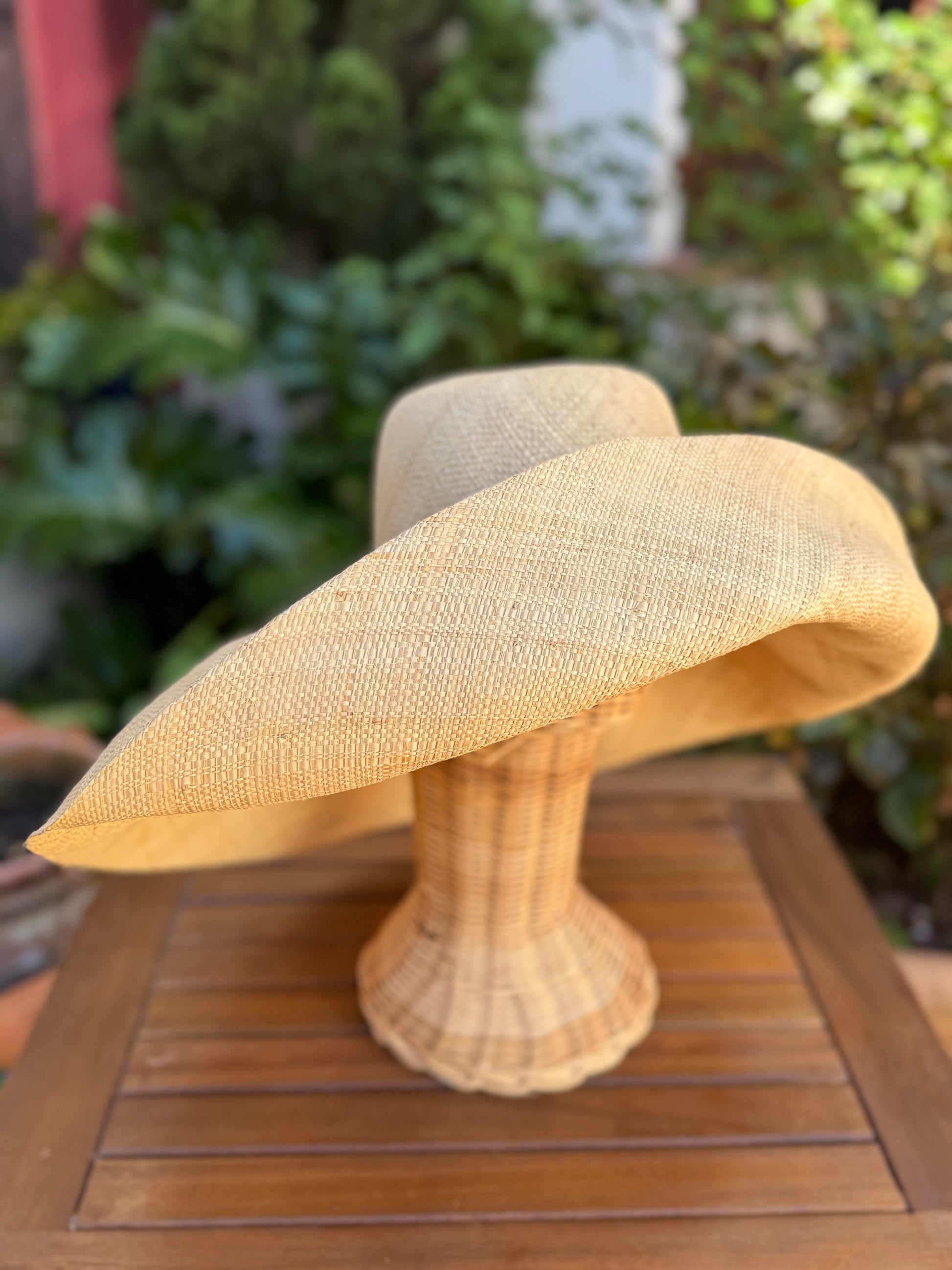 Pamela de rafia natural teñida a mano. Muy moldeable, se puede colocar de diferentes formas. Es el complemento perfecto.