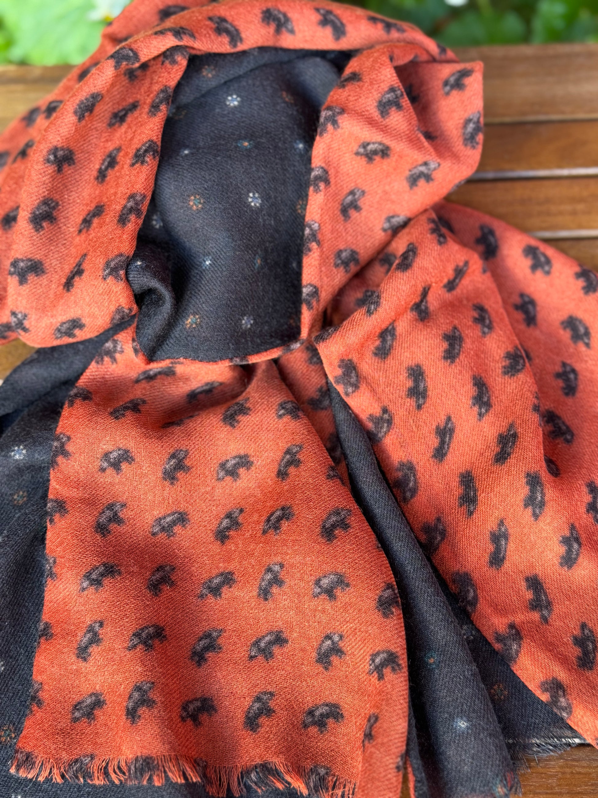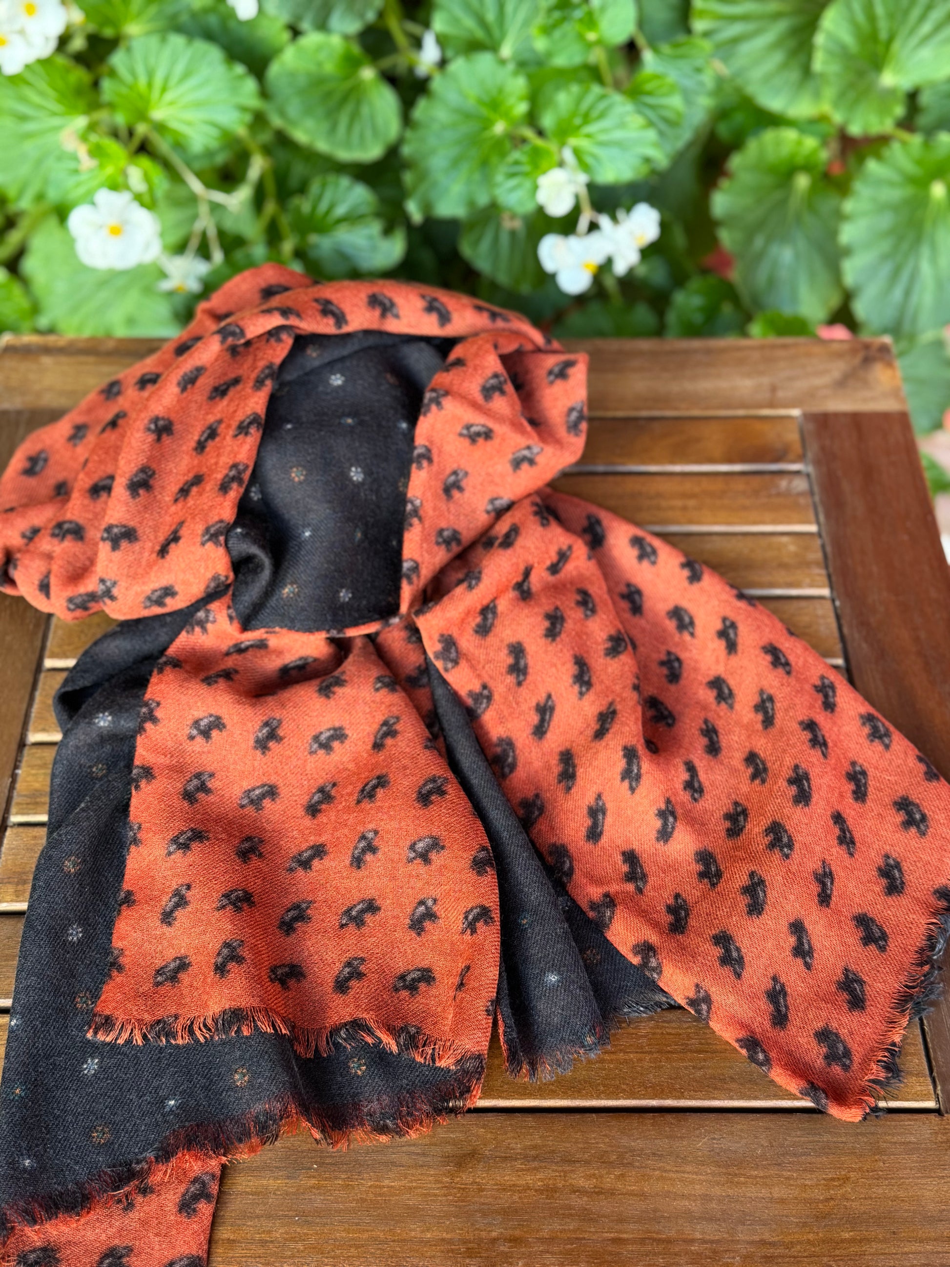 Pañuelo largo de lana virgen, reversible, combinado en estampado teja y gris. Ideal para completar tu look.
