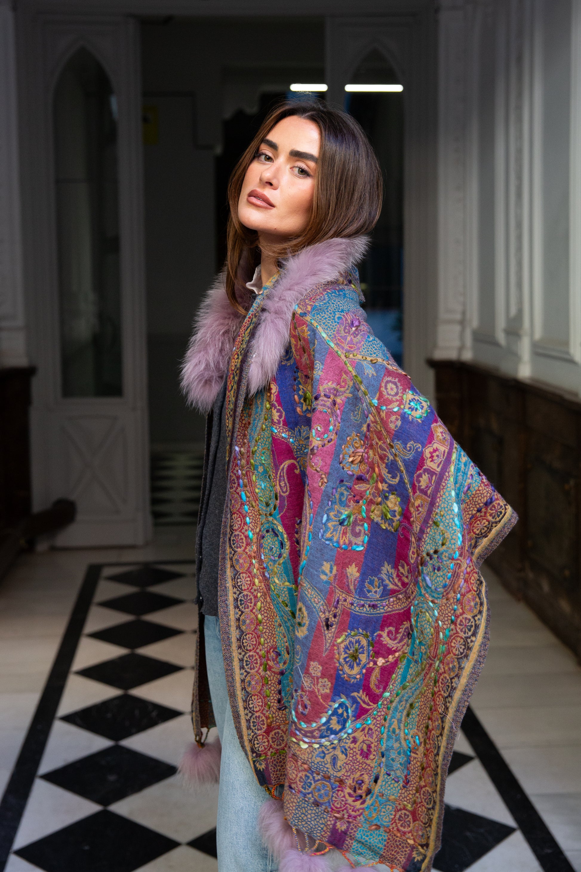 Pashminas tipo capa de lana y cashmere bordadas a mano con pelo natural de marmota en el cuello y extremos con pompones del mismo tono.