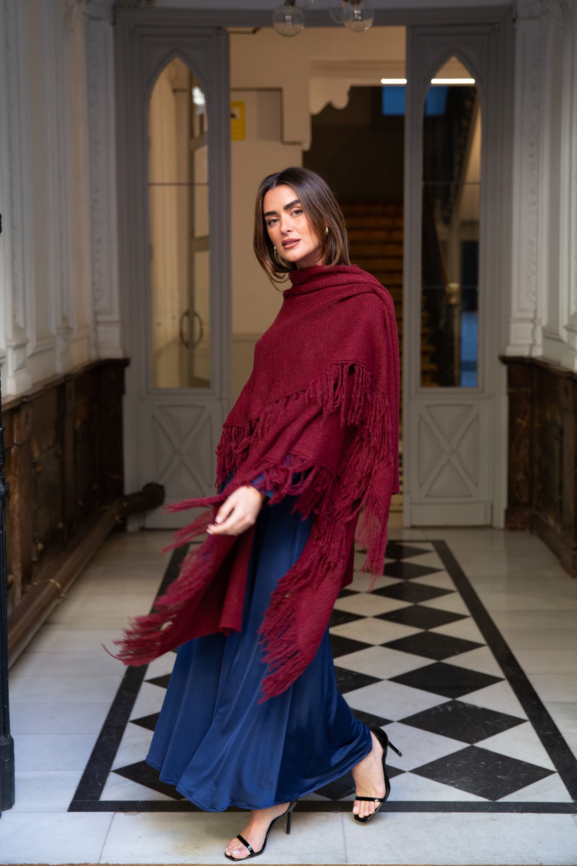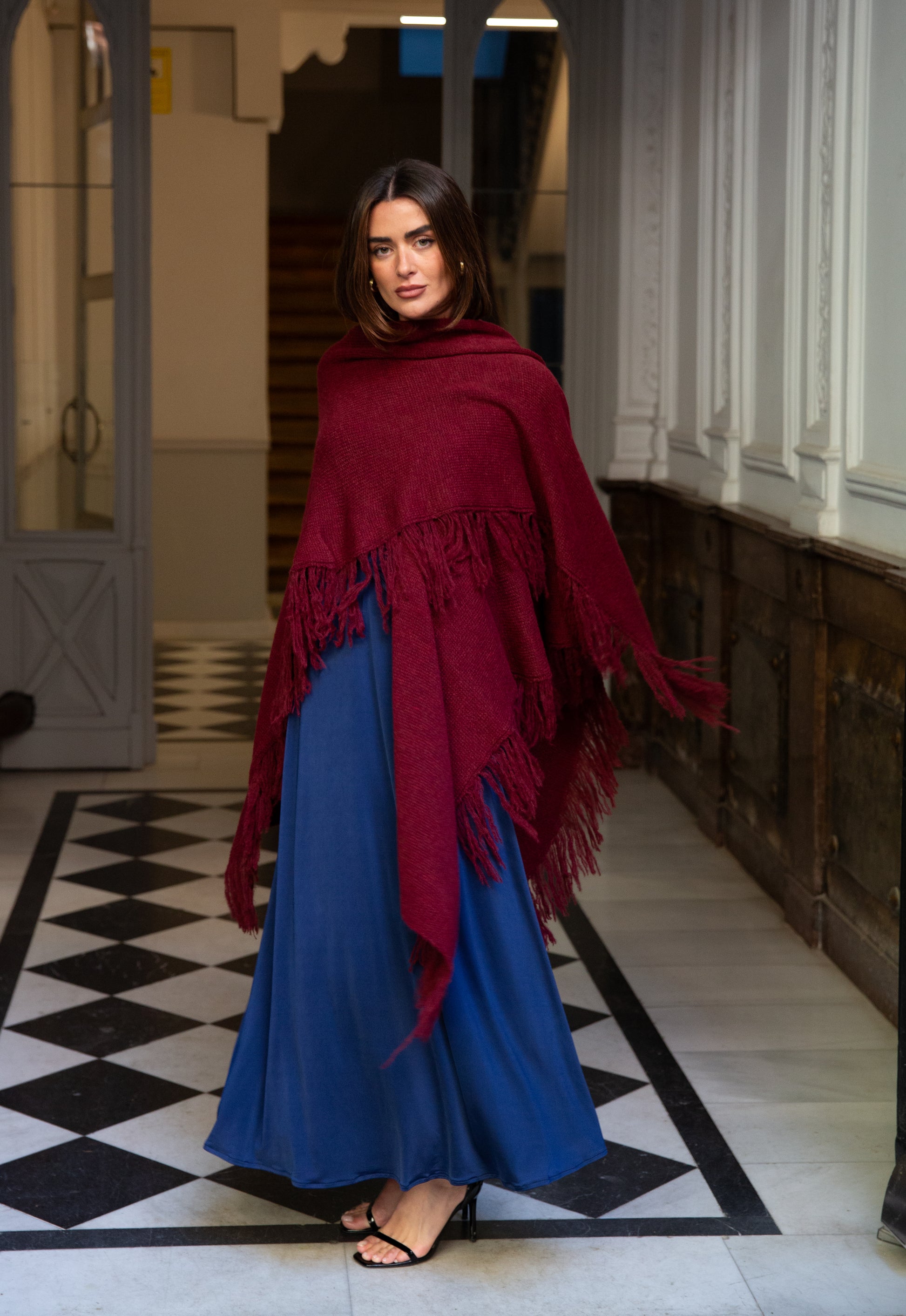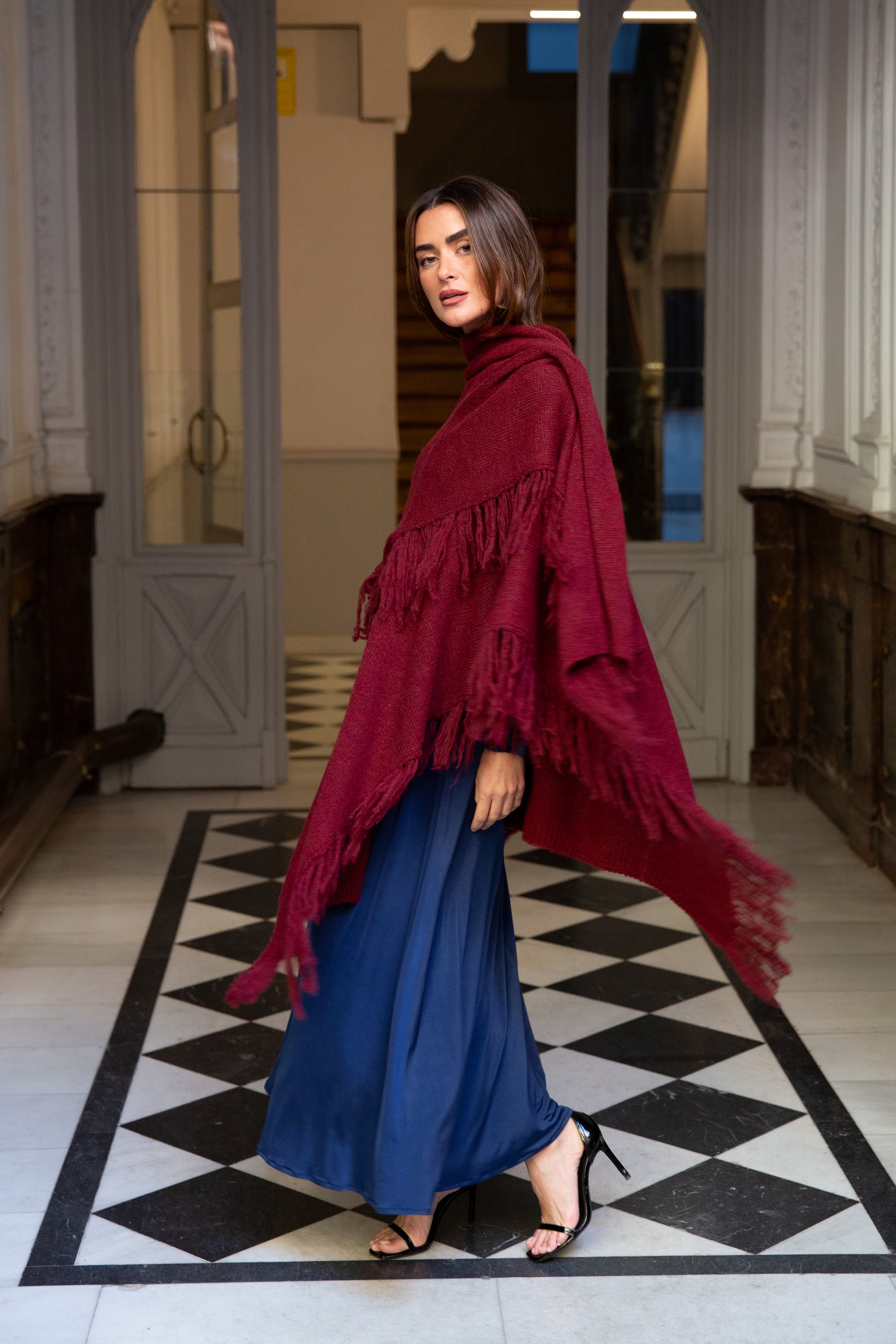 Poncho con flecos largos, multiposición, para llevarlo encima de tu vestido de fiesta o con unos vaqueros.