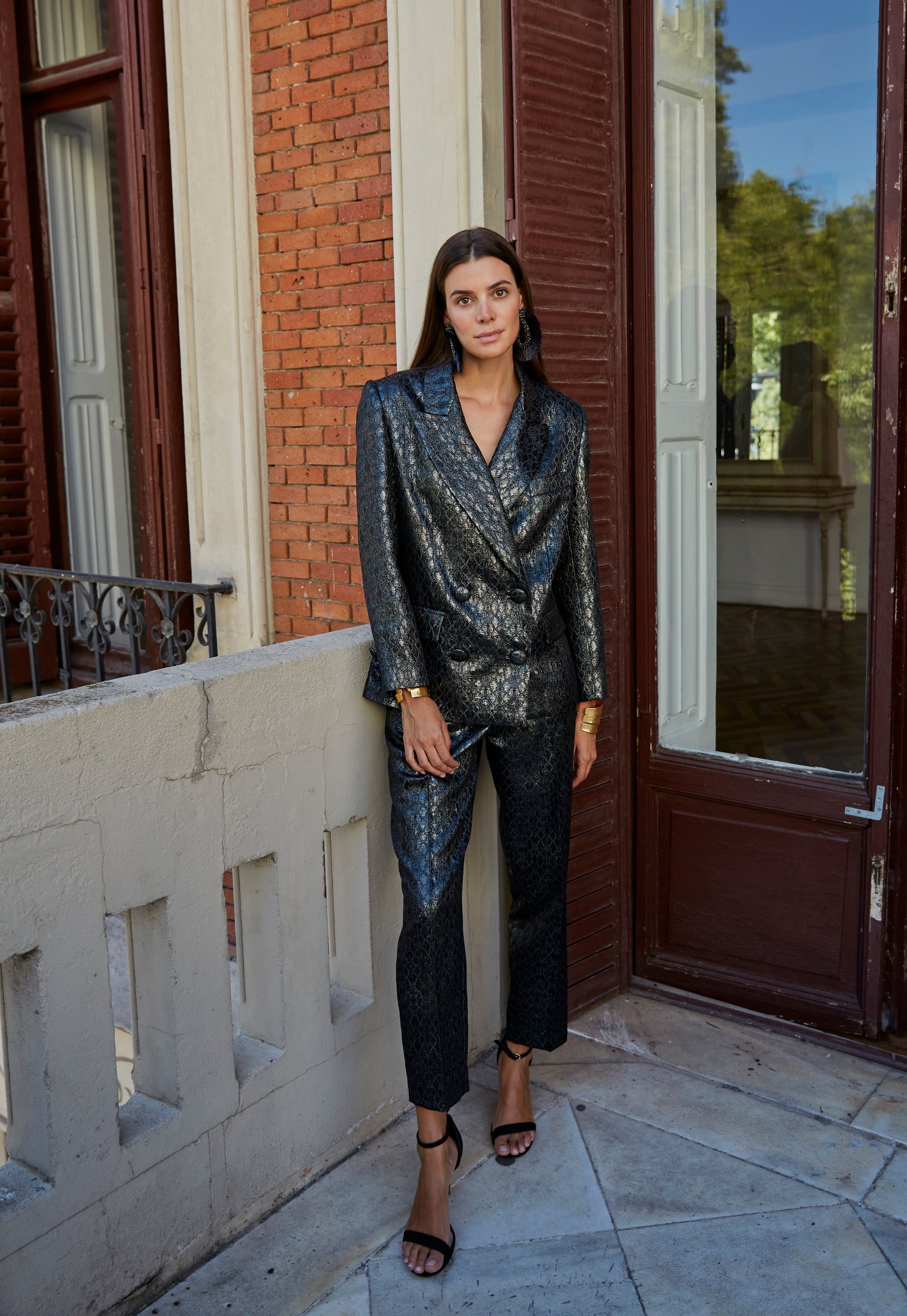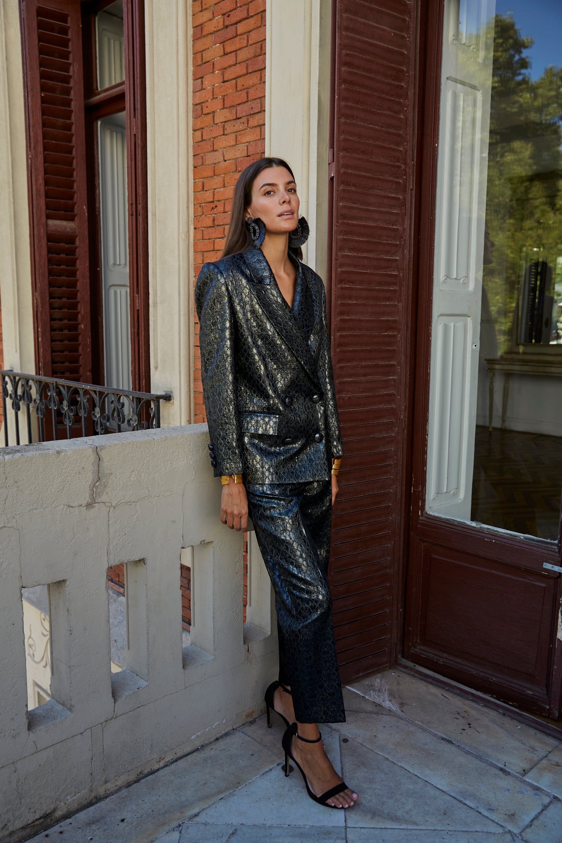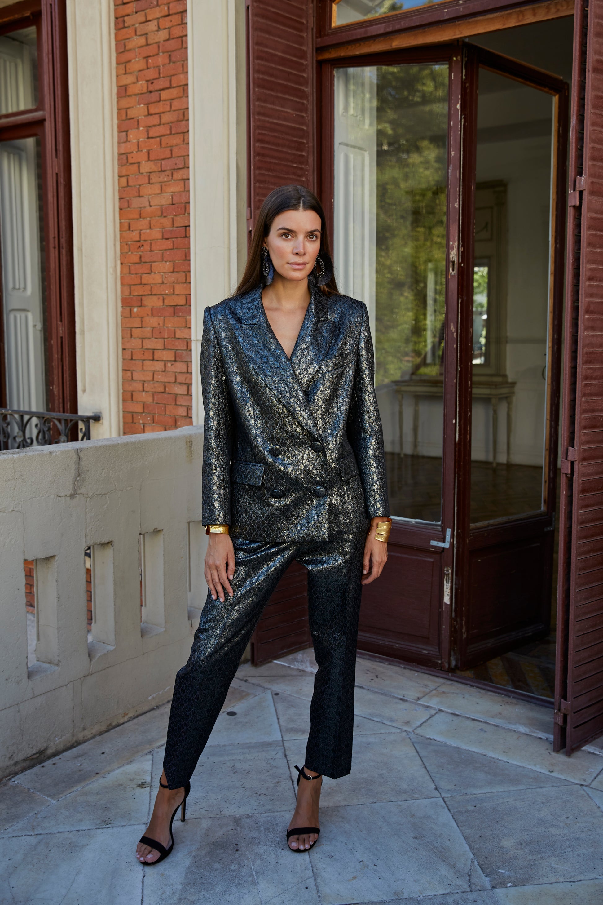 Traje de chaqueta confeccionado en tejido jacquard estampado tonos gris verdoso metalizado. Chaqueta con solapa, con doble botonadura cruzada, puño con botoncitos. Chaqueta forrada. Pantalón pitillo largo tobillo con bolsillos laterales.
