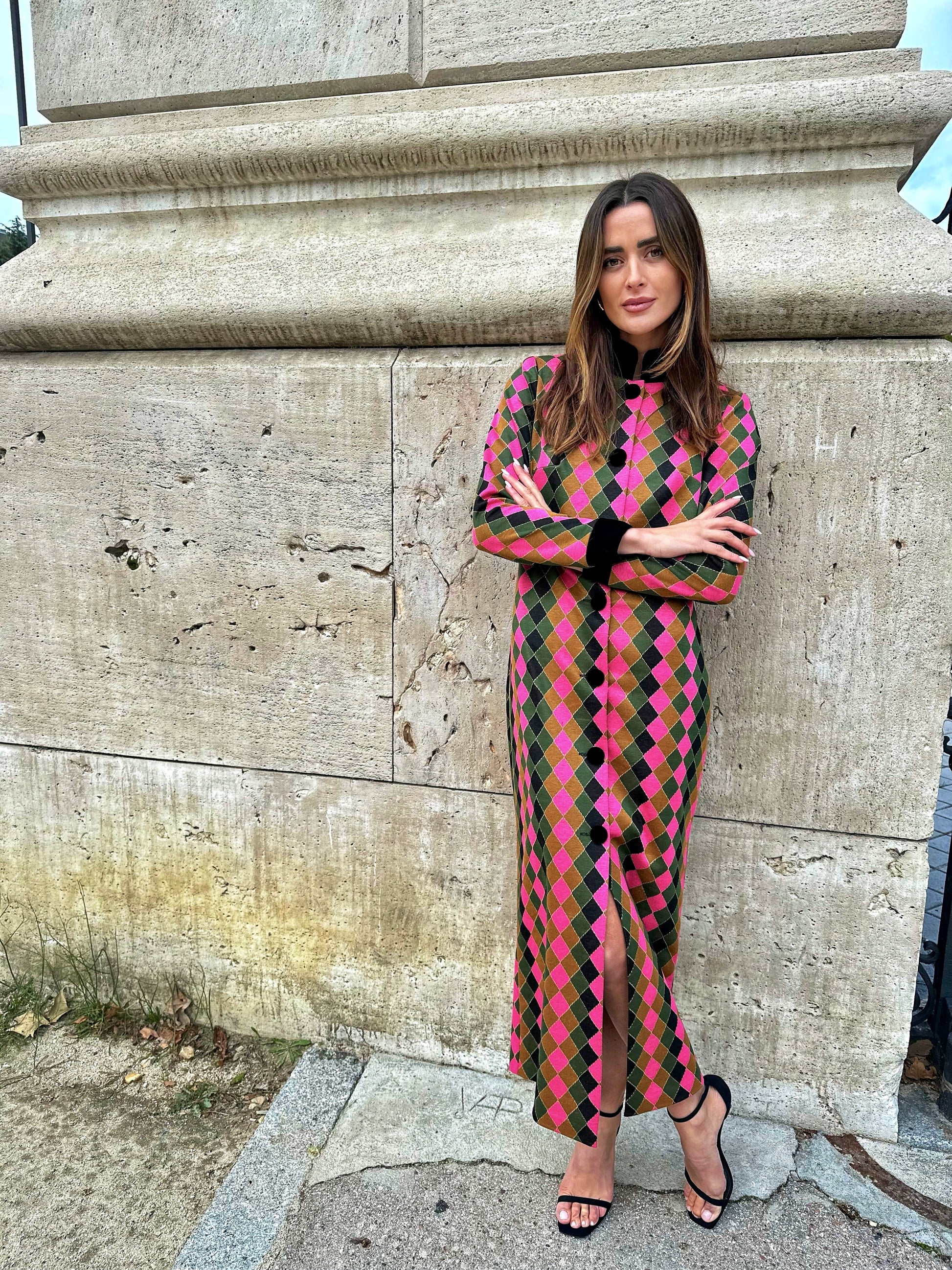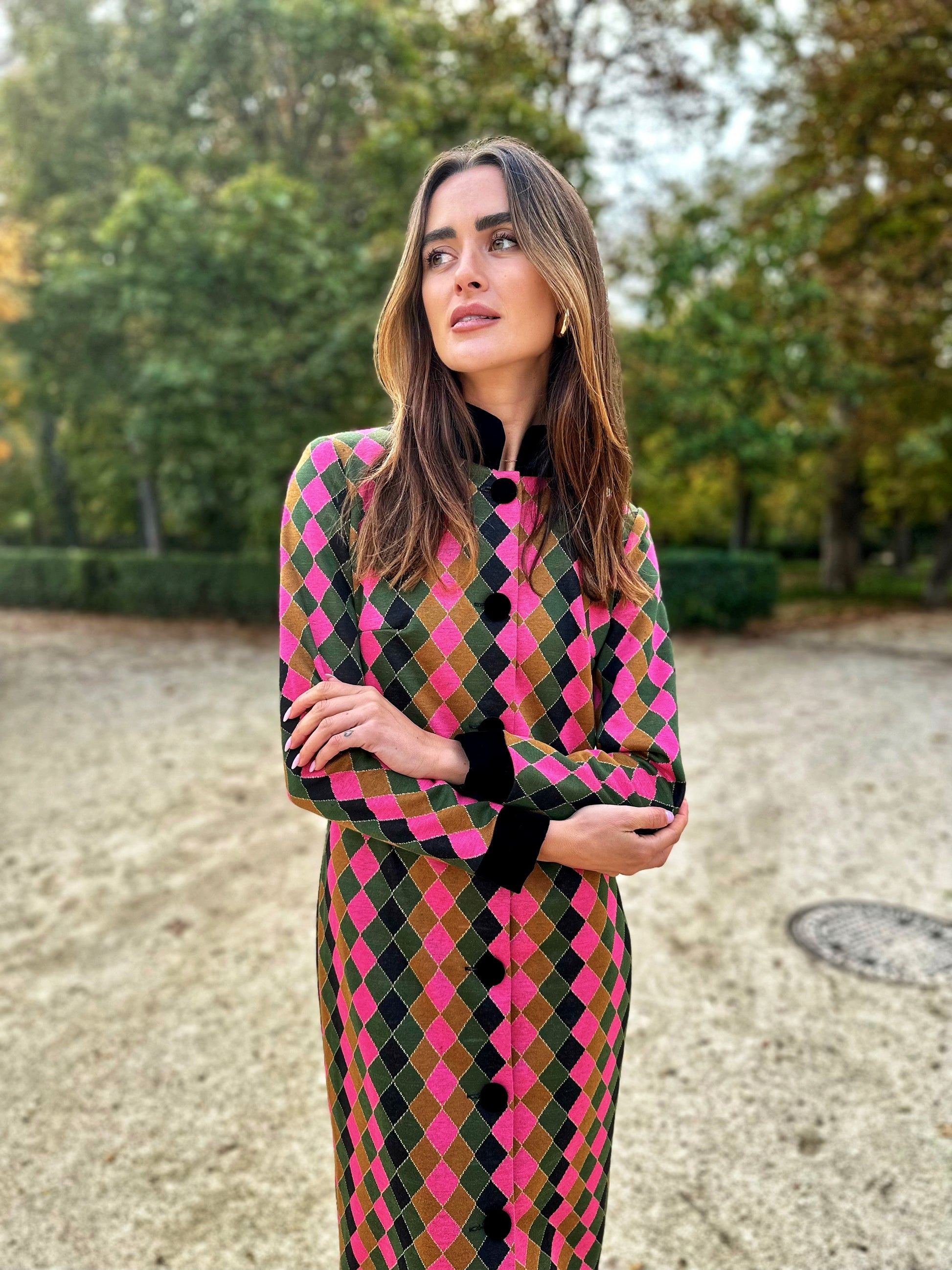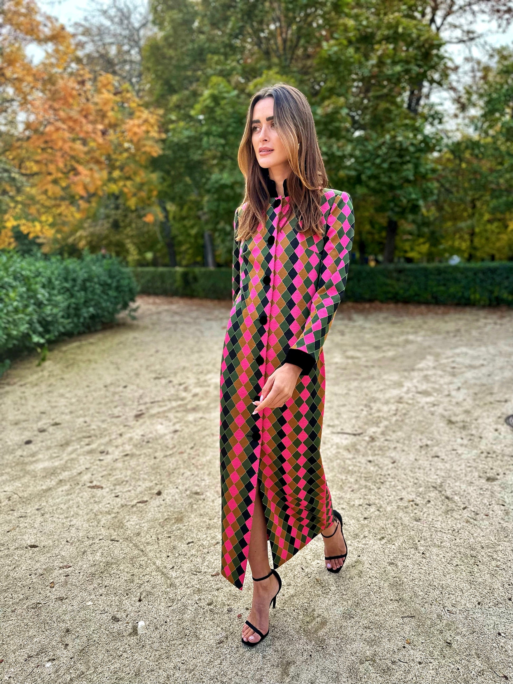 Vestido de Fiesta midi cerrado con botones delanteros. Cuello con tirilla de terciopelo, puños y botones de terciopelo negro. Confeccionado en tejido jacquard estampado arlequin en fucsia, verde, tostado y negro.