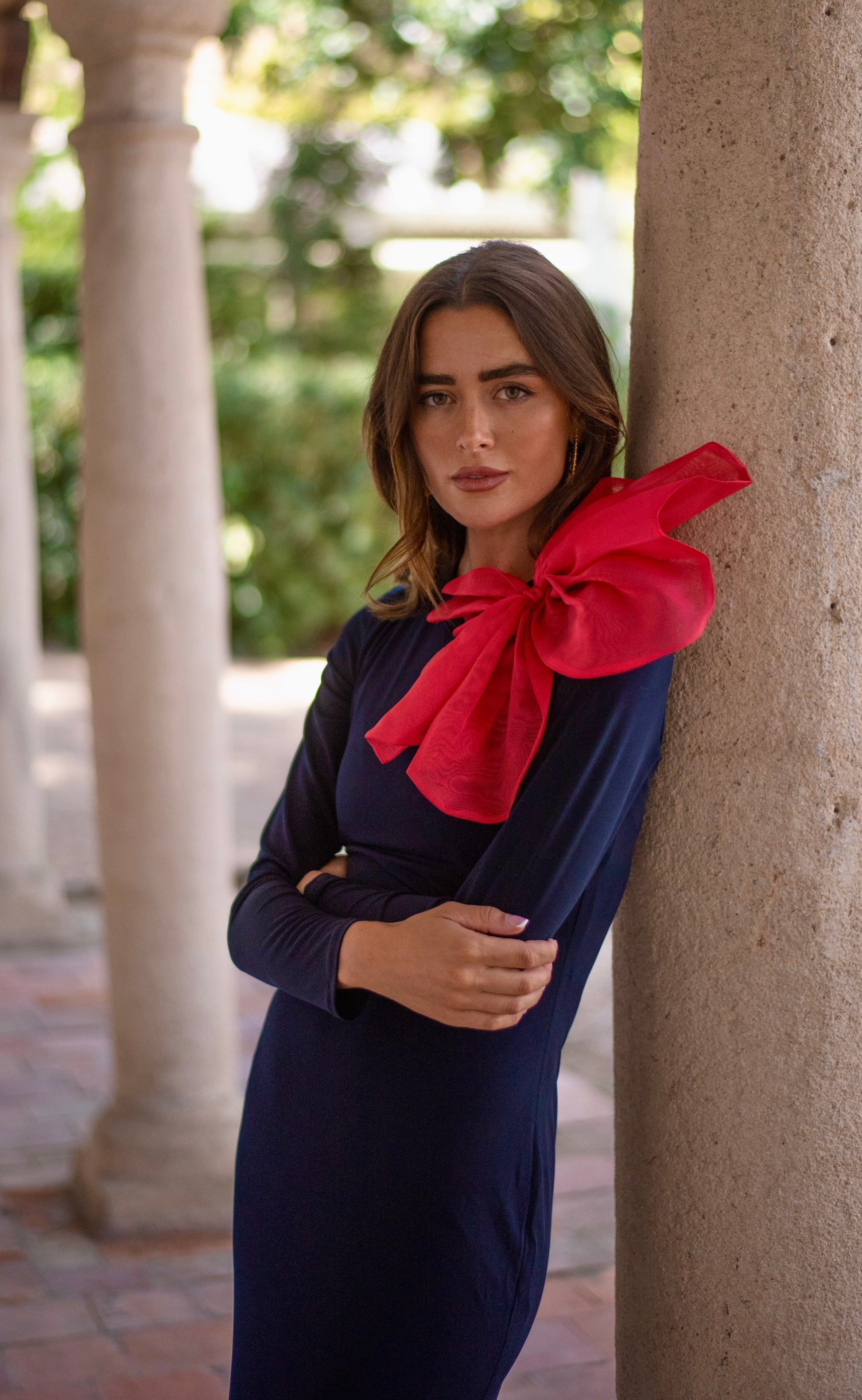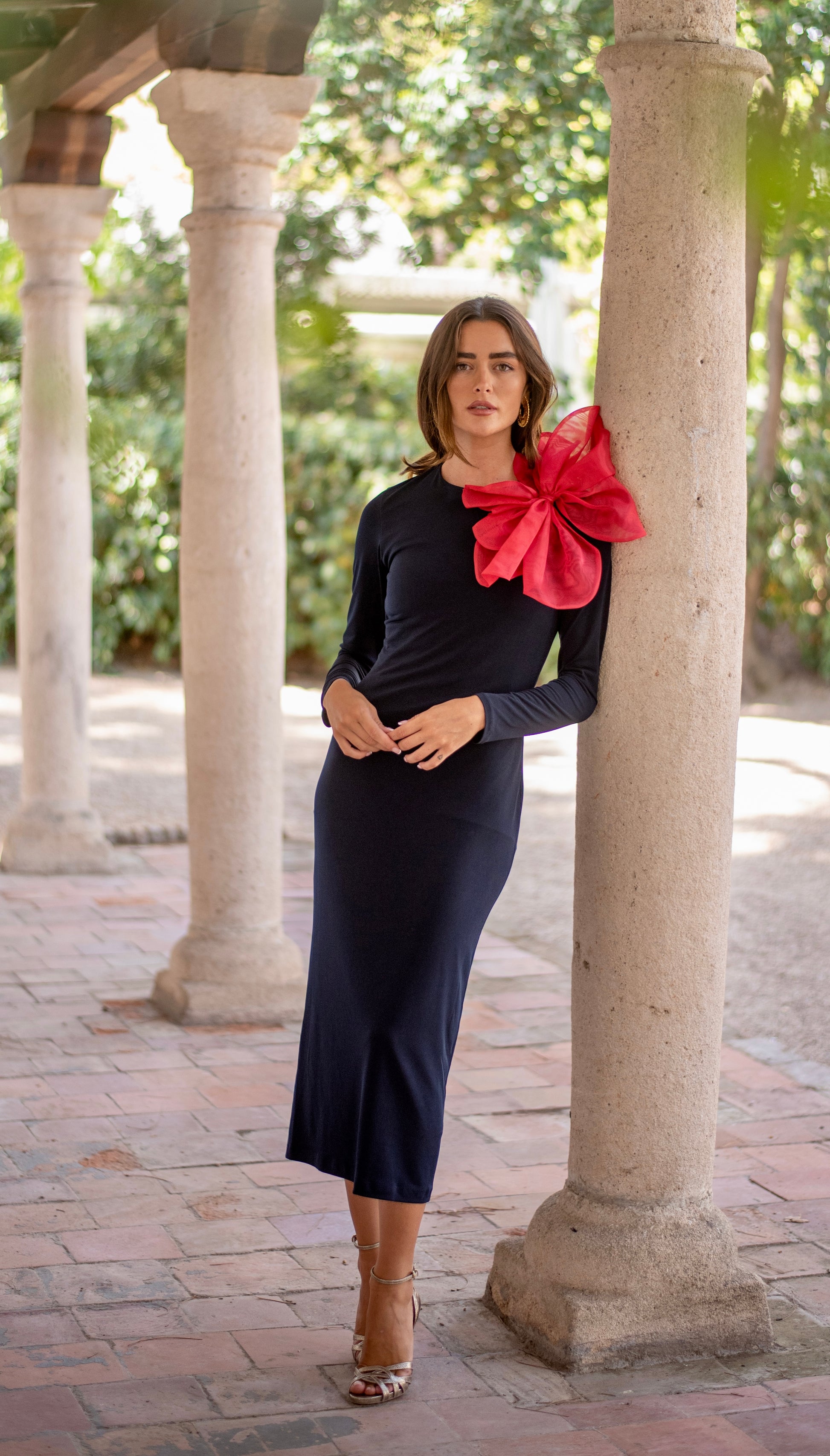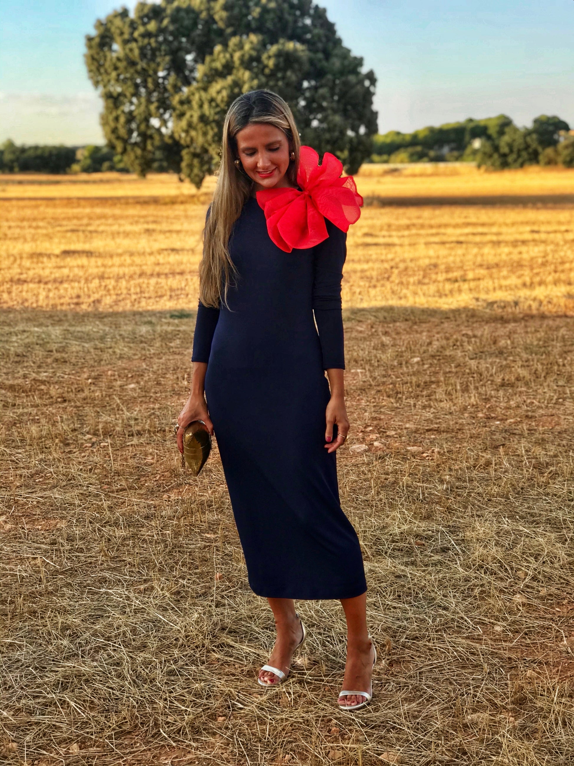 Vestido Fiesta midi de punto de seda azul marino con gran flor roja de organza. Vestido forrado.