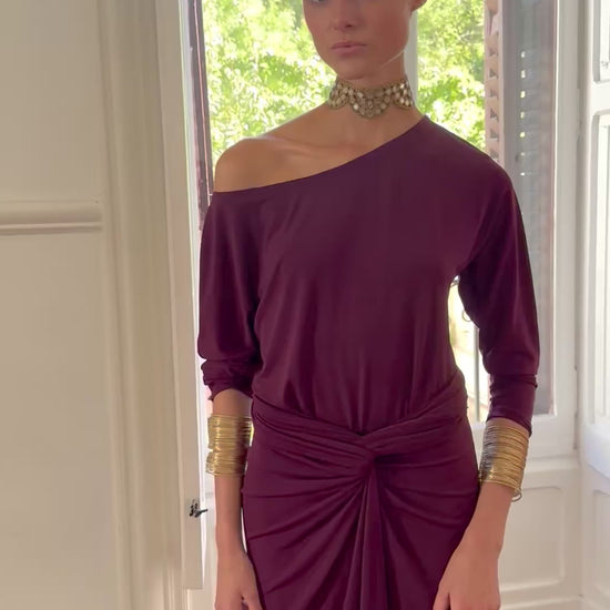 Vestido de Fiesta midi, vestido manga larga, con cuello barco que permite colocarlo a su gusto dejando un hombro descubierto. Falda de pañal multiposición pudiendo anudarla por delante o por detrás.