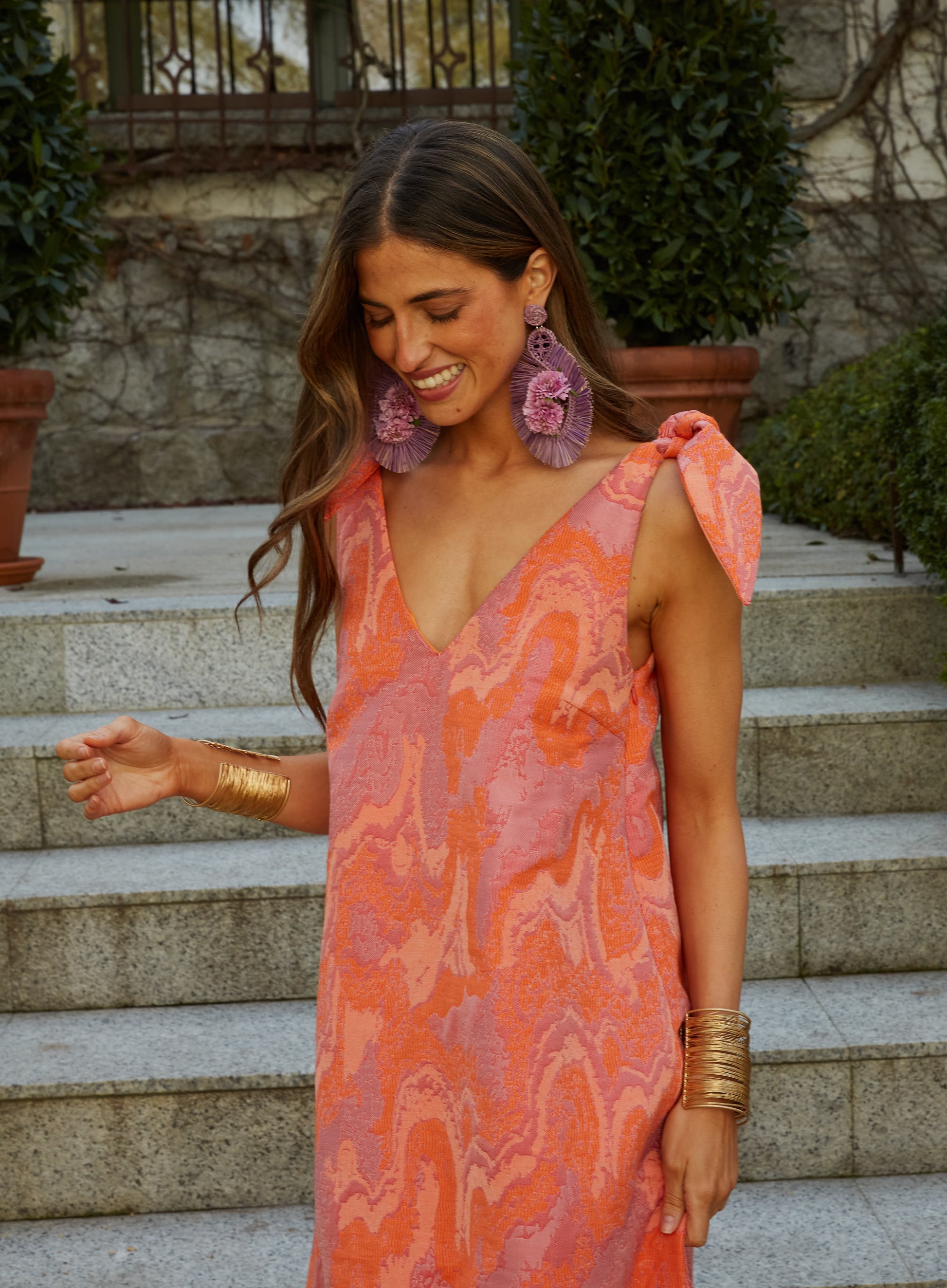 Los tirantes con lazos en los hombros añaden un detalle femenino y versátil que equilibra la amplitud del diseño. El estampado en tonos naranja y rosa aporta energía y luminosidad, creando una propuesta ideal para bodas y celebraciones de primavera y verano.