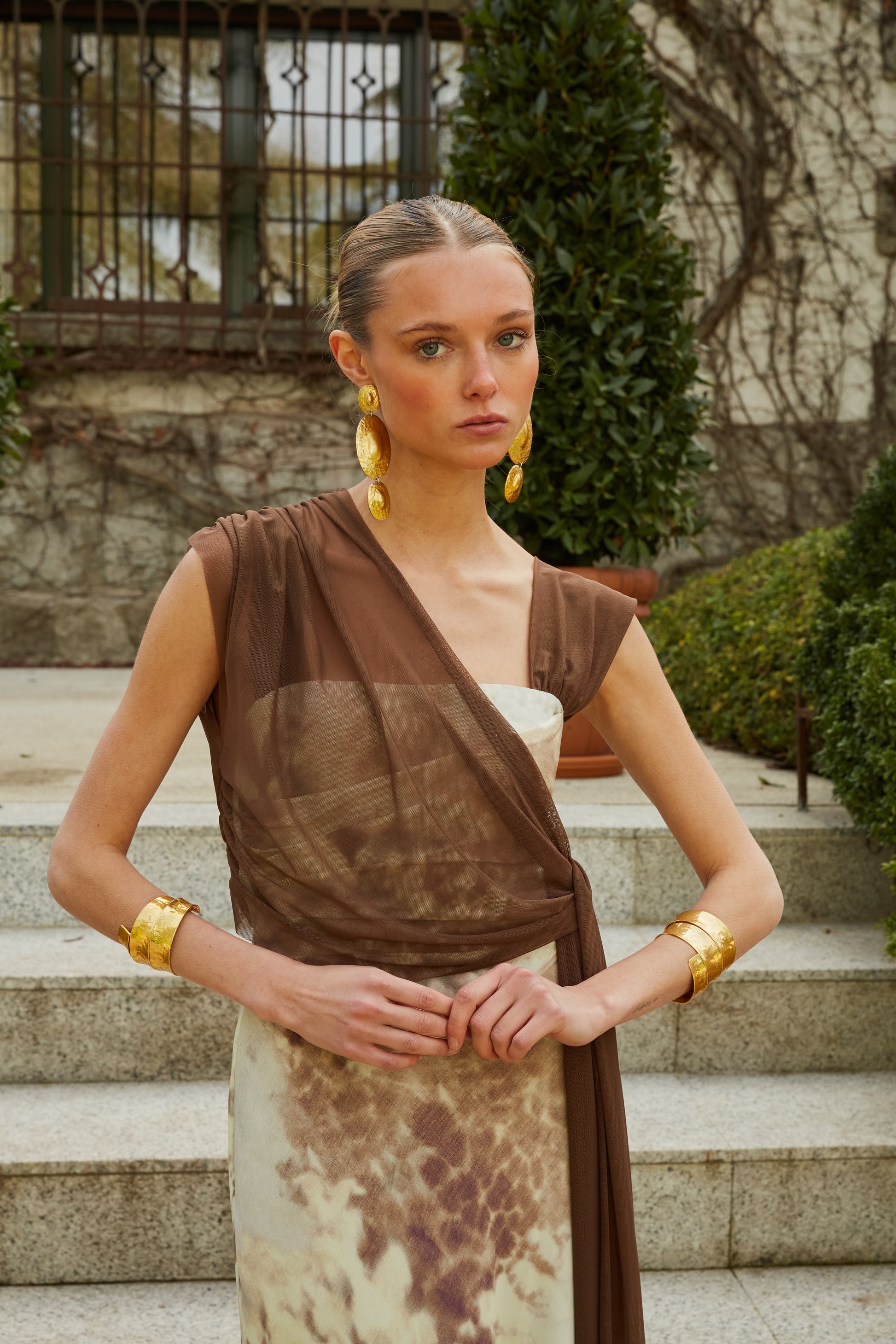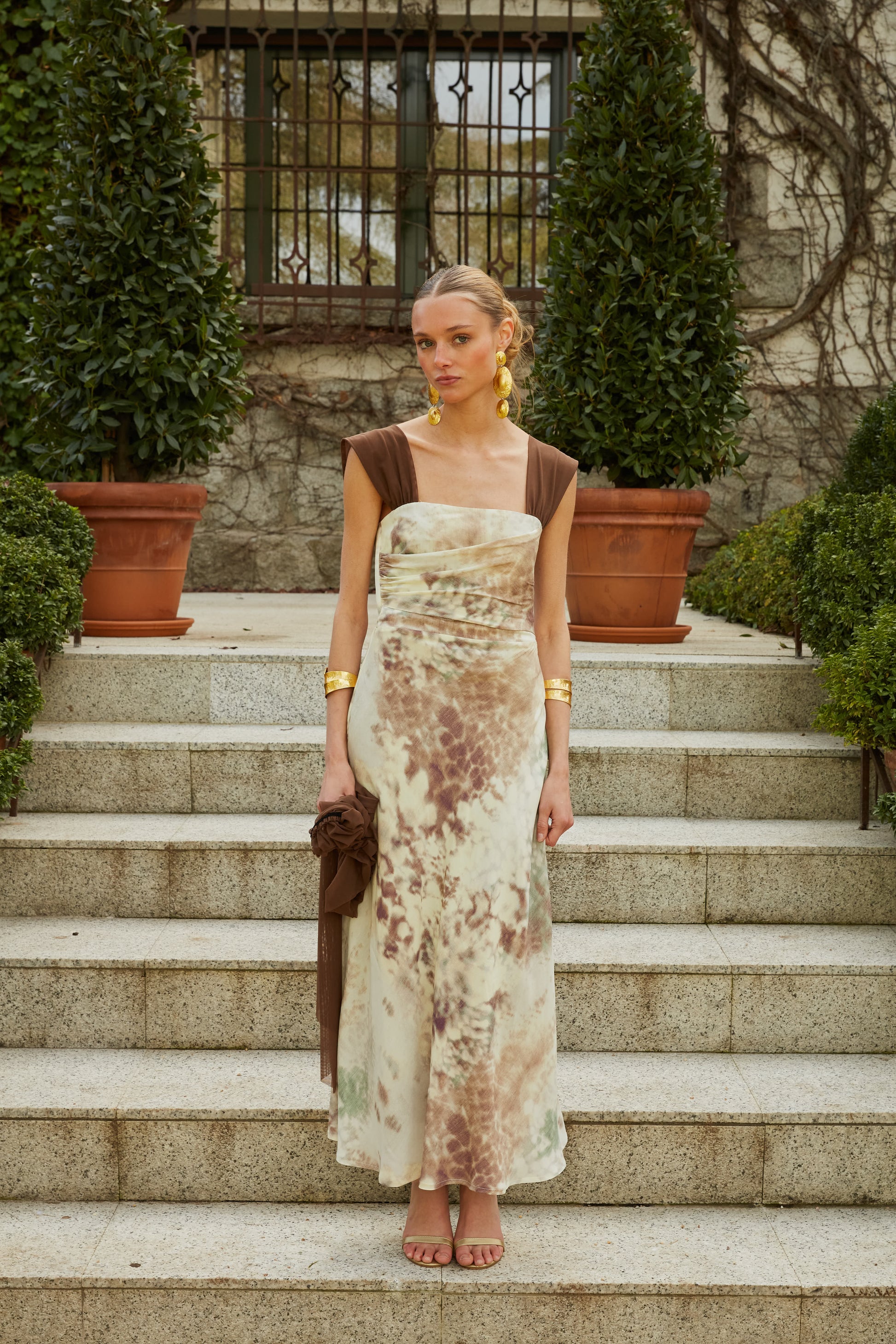 O vestido castanho com estampado de lulas combina movimento e personalidade numa silhueta naturalmente favorecedora. A sua bainha até ao tornozelo e a saia cortada na diagonal criam um ajuste fluido que acompanha graciosamente cada passo.