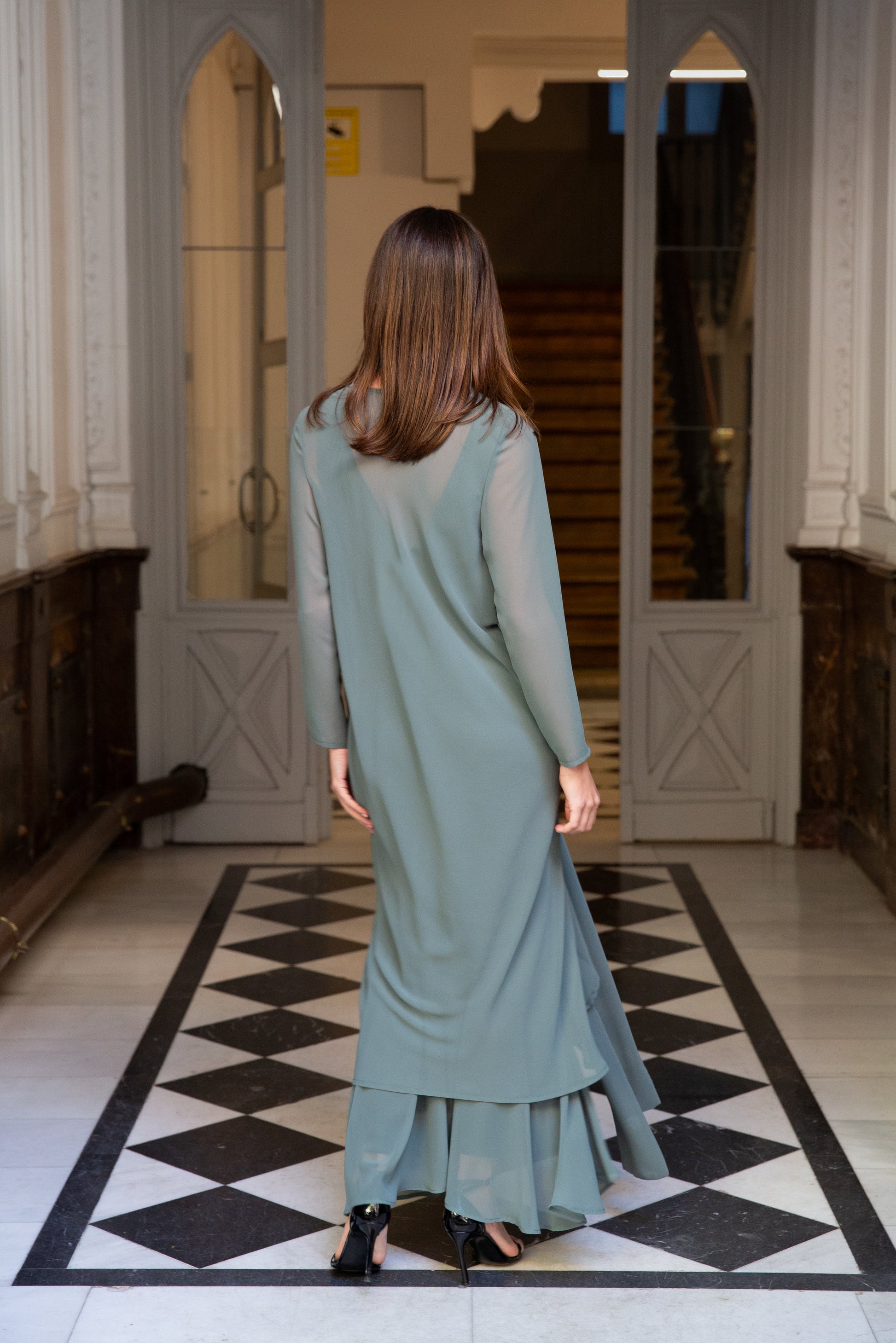 Vestido de festa comprido estilo slip com folho assimétrico na base e decote em V na frente e nas costas. Inclui um casaco de chiffon versátil que pode ser usado de diferentes formas. Fabricado em chiffon fino verde-claro. Totalmente forrado.